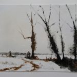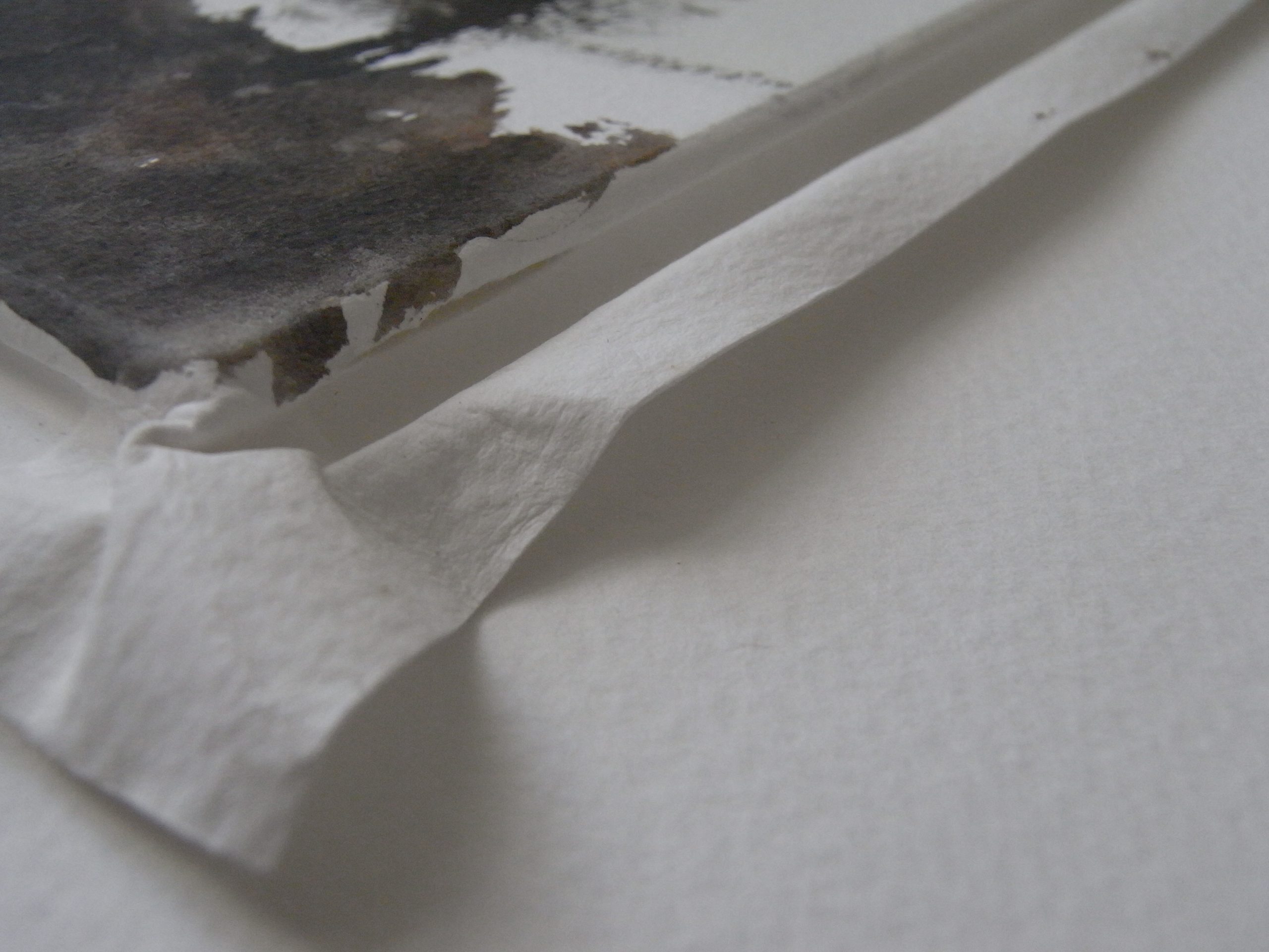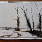 Then, on one of my recent trawls around ebay, I came across a Ken Bromley Perfect Paper Stretcher which took my interest. It’s basically a flat board with recessed grooves on all four sides into which fit four lengths of firm but flexible rubber. The principle is simple; thoroughly soak your paper – I left this sheet in the bath for about ten minutes – place your board (which has to be approximately 3/4 of an inch smaller all the way round than your paper) centrally onto the paper, fold the paper over the edges and gently hammer the rubber tensioners into the grooves to trap and stretch the paper. As the stretcher that I’d found on ebay happened to be for 1/4 sized sheets of paper – I took it as a sign that I had to win the auction and try it out. At the back of my mind, I was also thinking that should I ever wish to be a little more ‘public’ with my work, then I might have to get used to stretching the odd piece of paper.