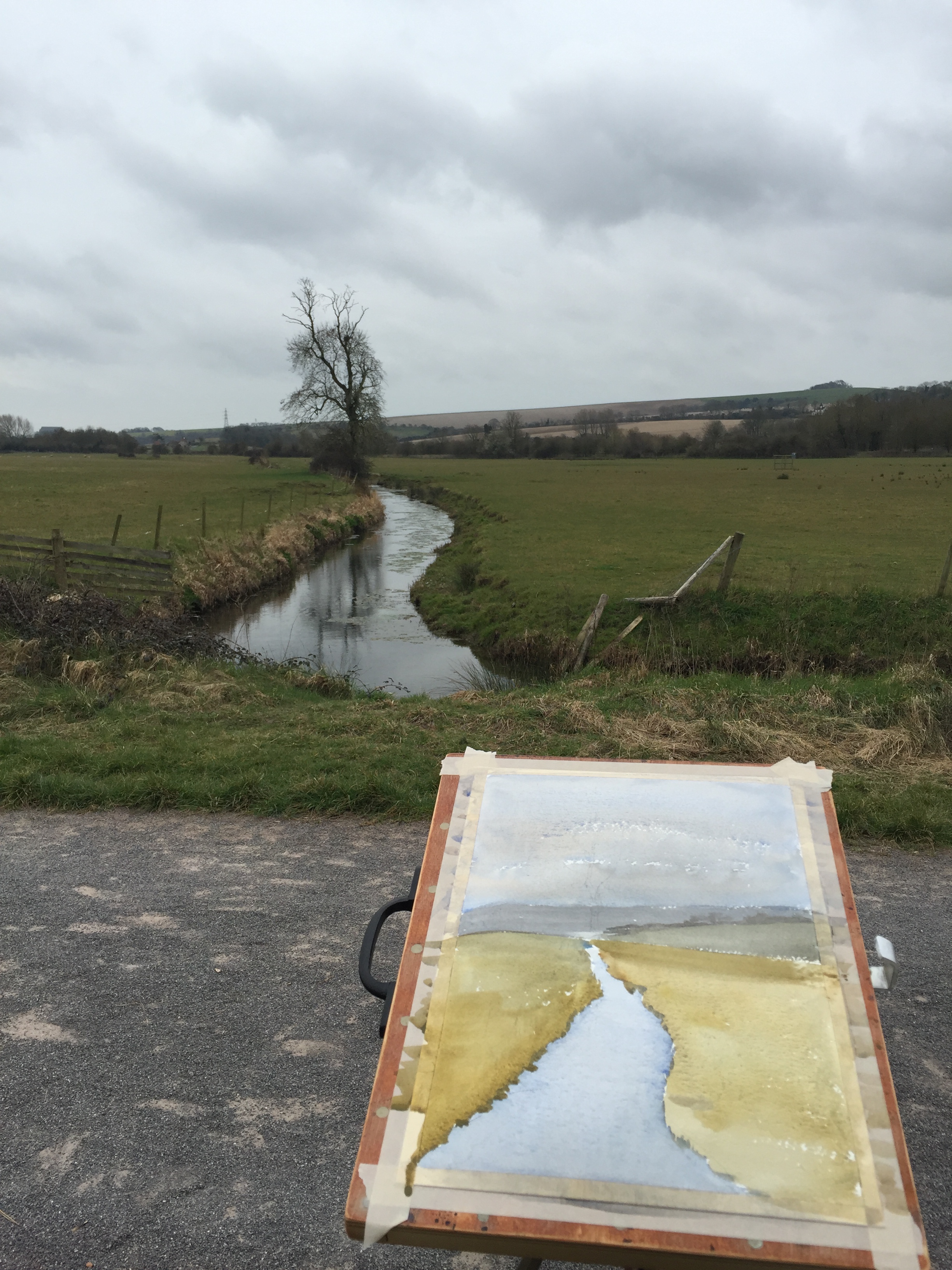 I’d spotted this scene on a recent day out and earmarked it as an ideal subject. It’s very much in the Seago ilk, plus it’s delightfully remote as right behind this viewpoint is a steep bank leading up to a busy road. Aside from the odd dog walker, jogger and horse-rider, I was completely alone and didn’t have to contend with anyone looking over my shoulder – which I’m just not ready for yet! I was able to park a short distance away and try out carrying my kit and I’m delighted to say it was all light and easy to carry.