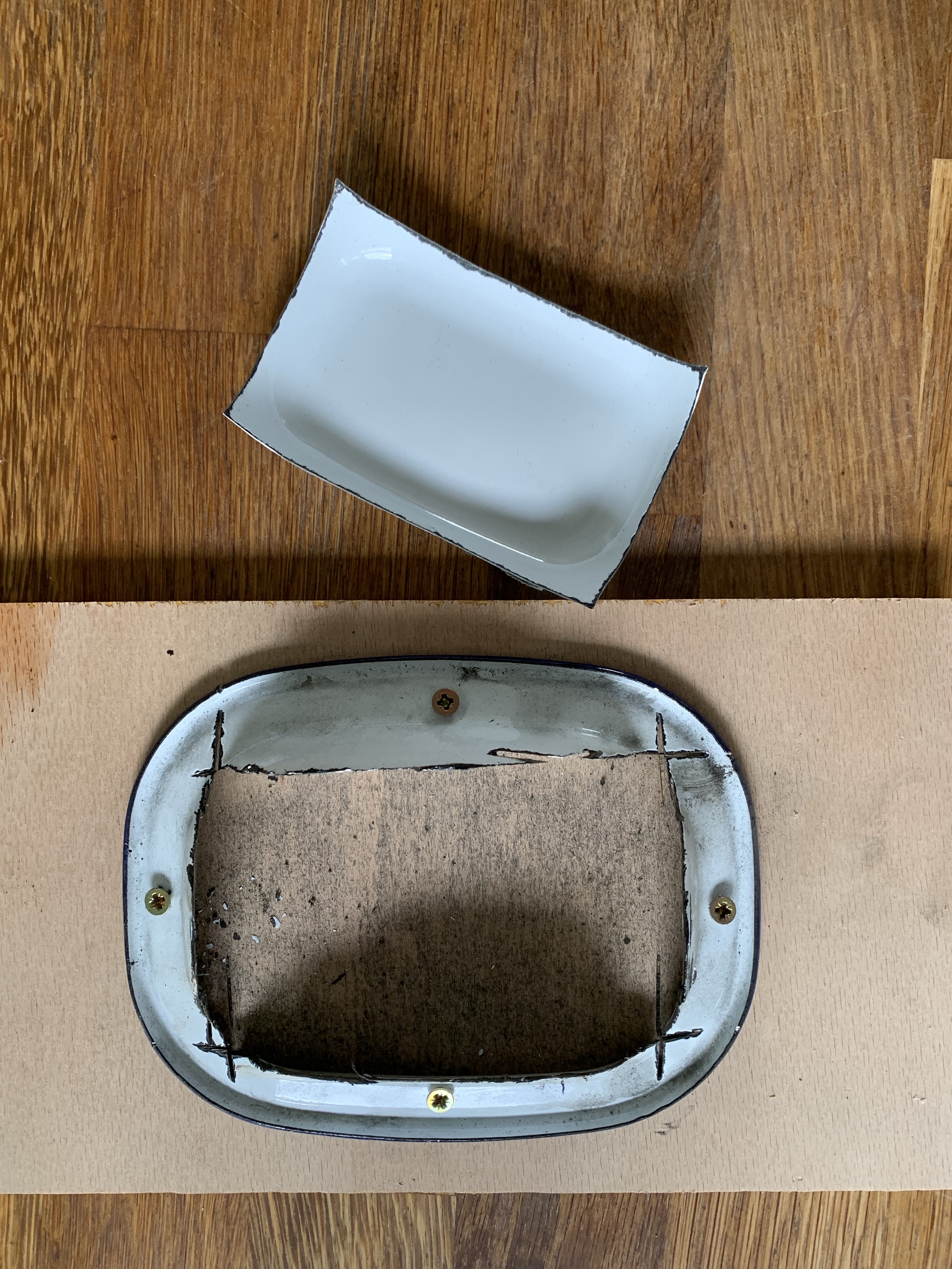 My idea was to create a single large mixing well out of a small enamelled pie dish. I had already bought one of these some time ago so all I needed was some time and a bit of consideration as to how to do it! I had intended to document this process more thoroughly but, as it was, I got a bit carried away and only thought about photographing it when I was pretty much done and dusted with it.