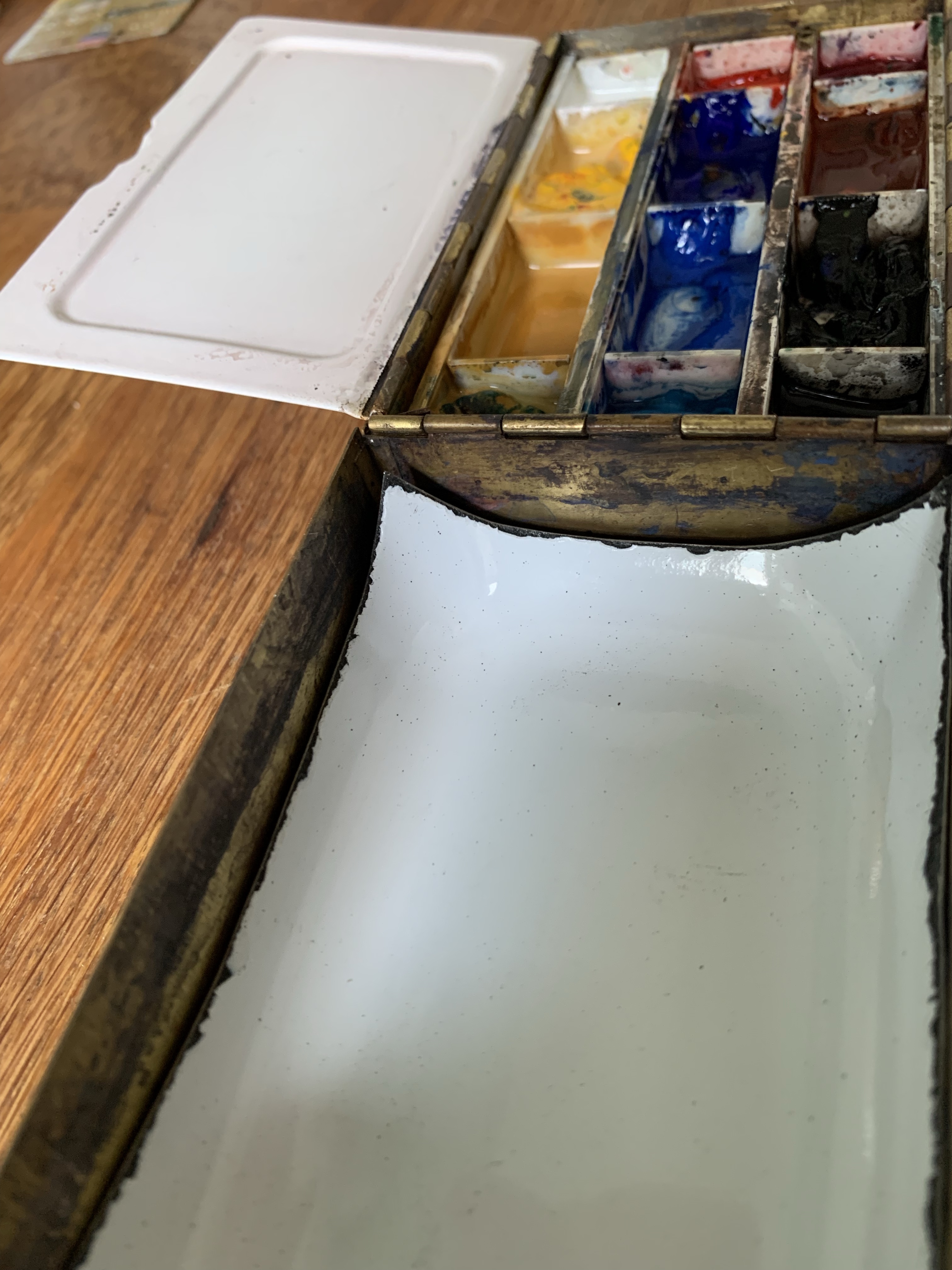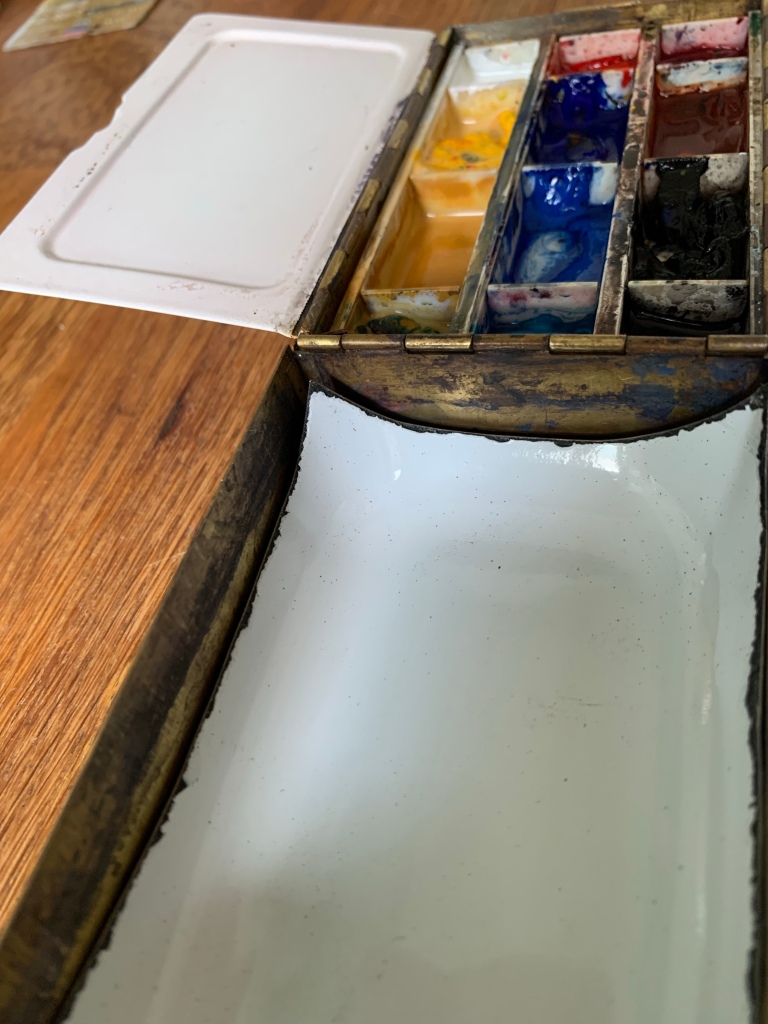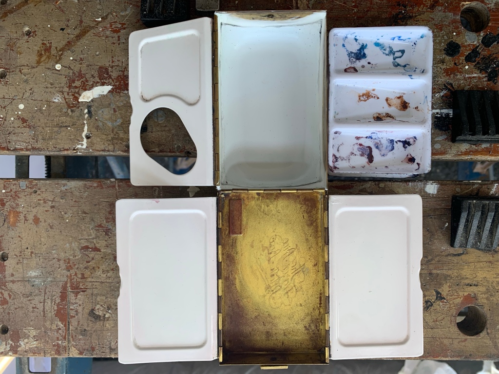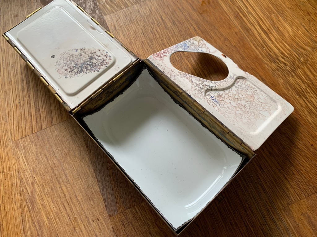 Note the three welled plastic palette that I’d cut to size and inserted into the palette. While this was okay, and did allow me to mix up some larger quantities of paint than was possible on the flat surfaces, I never really enjoyed painting from these. Maybe I’ve been spoiled over the past few years by only mixing my paint on enamalled surfaces!