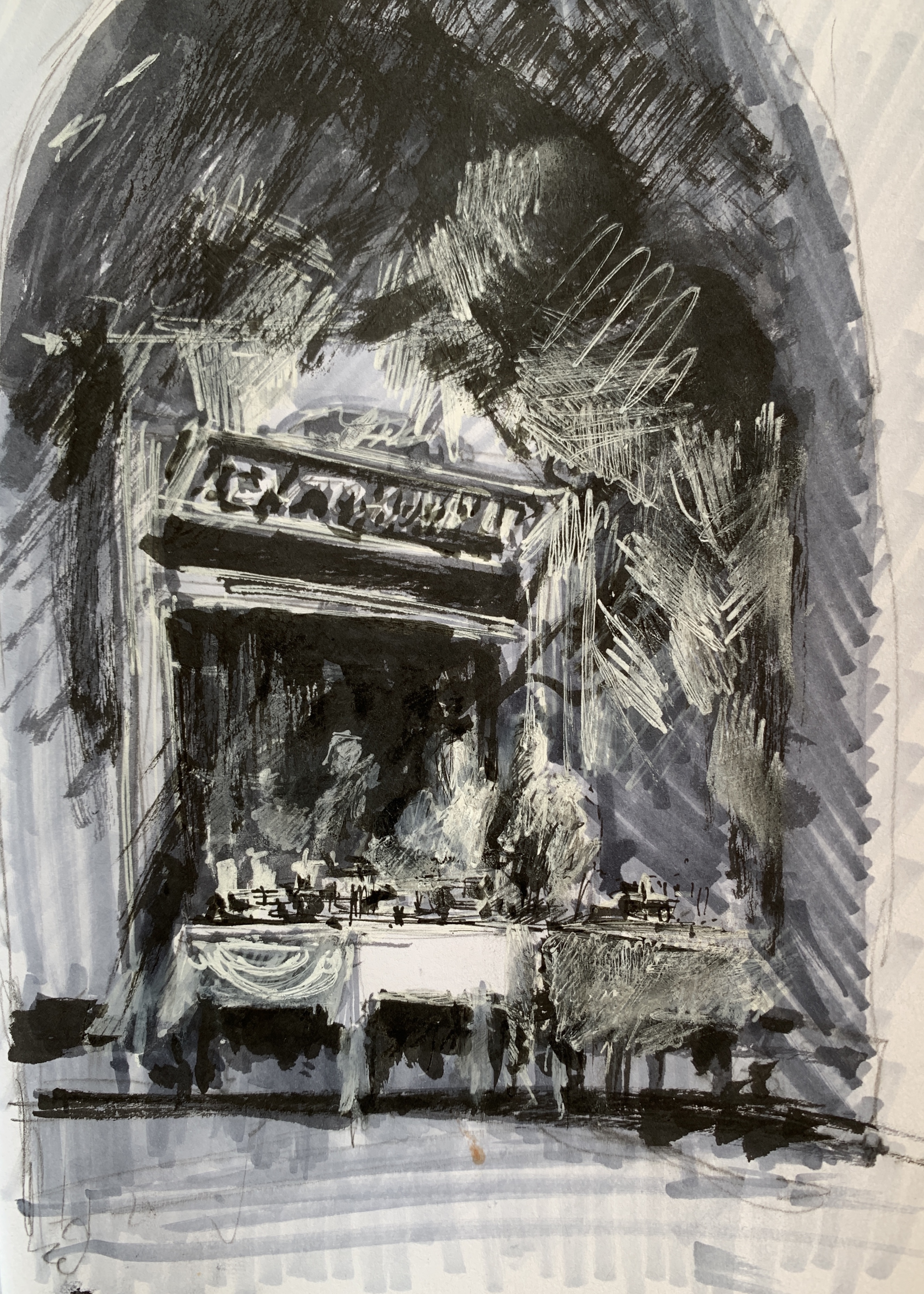Hi Rob and thanks for this. I think with the copic marker pens, I’m also culpable of creating some of the dirty marks! My intention was to use them to create say 5 distinct tones. The way that I’m using them however is that I’m often layering them, so end up with lots and lots of tones, on top of which I’m then applying a bit of white gel pen and smudging it with my finger! I think what I’m trying to navigate is making the sketches as useful as possible to paint from, versus the sketches being ‘finished’ works in themselves! Finding it to be quite a tough juggling act. You should definitely look into the ‘cheaper’ tripod adapter approach, I sure you’ve all the necessary tools and more than enough skill, and let’s be honest, who doesn’t like saving a bob or two!
