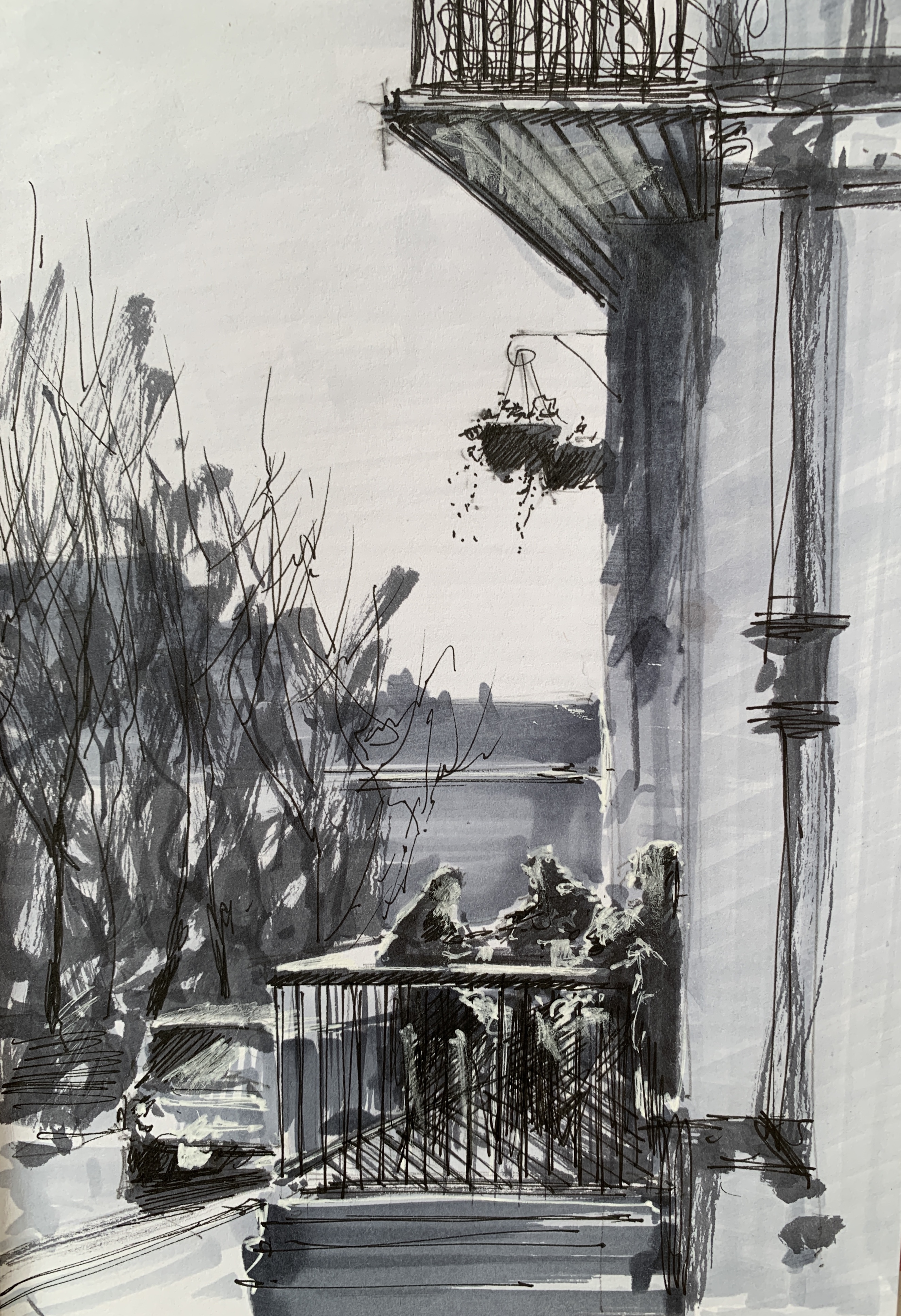 A good range of subjects and compositions here despite your straightened circumstances so I presume you’re relying on your new(ish) pens/markers. One thing that does bother me about them – I’m a very sensitive soul – is that there’s a distinct mismatch of warm and cool greys involved. This makes some of the tones look more like a dirty mark that an actual part of the composition. I have the same problem when using brush-pens for life drawing; it’s a bit dangerous to mix makers since they all seem to have a slightly different idea of what constitutes a mid-grey.