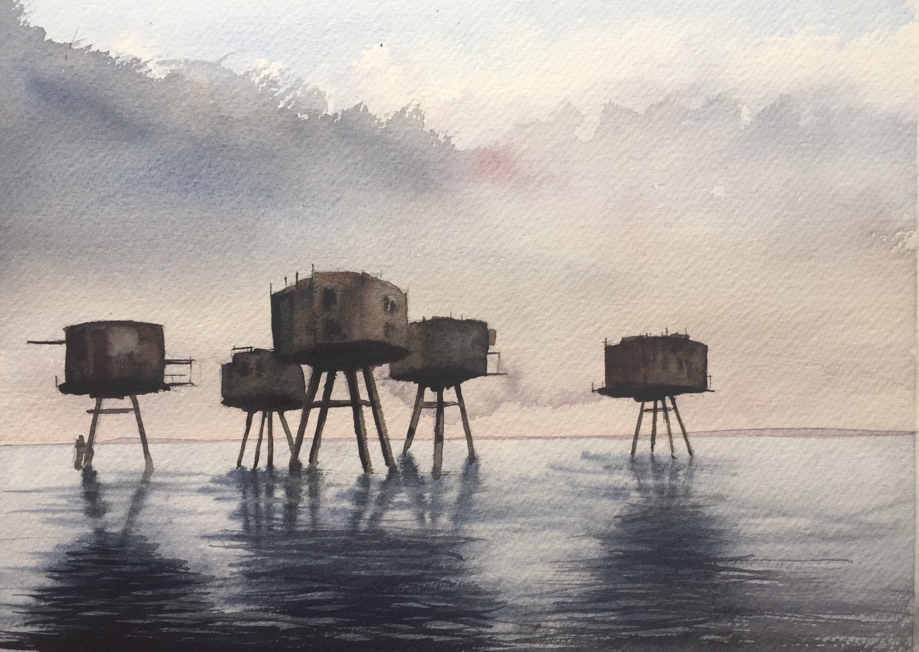 On that note, I’d like to thank David for leading me to tackle a watercolour challenge that I otherwise doubt I would have considered. I’ll leave you for now with a short aerial view video of one of the Maunsel sea forts that I think captures, a little more successfully than I managed with my painting, the majestic eeriness of these strange structures.