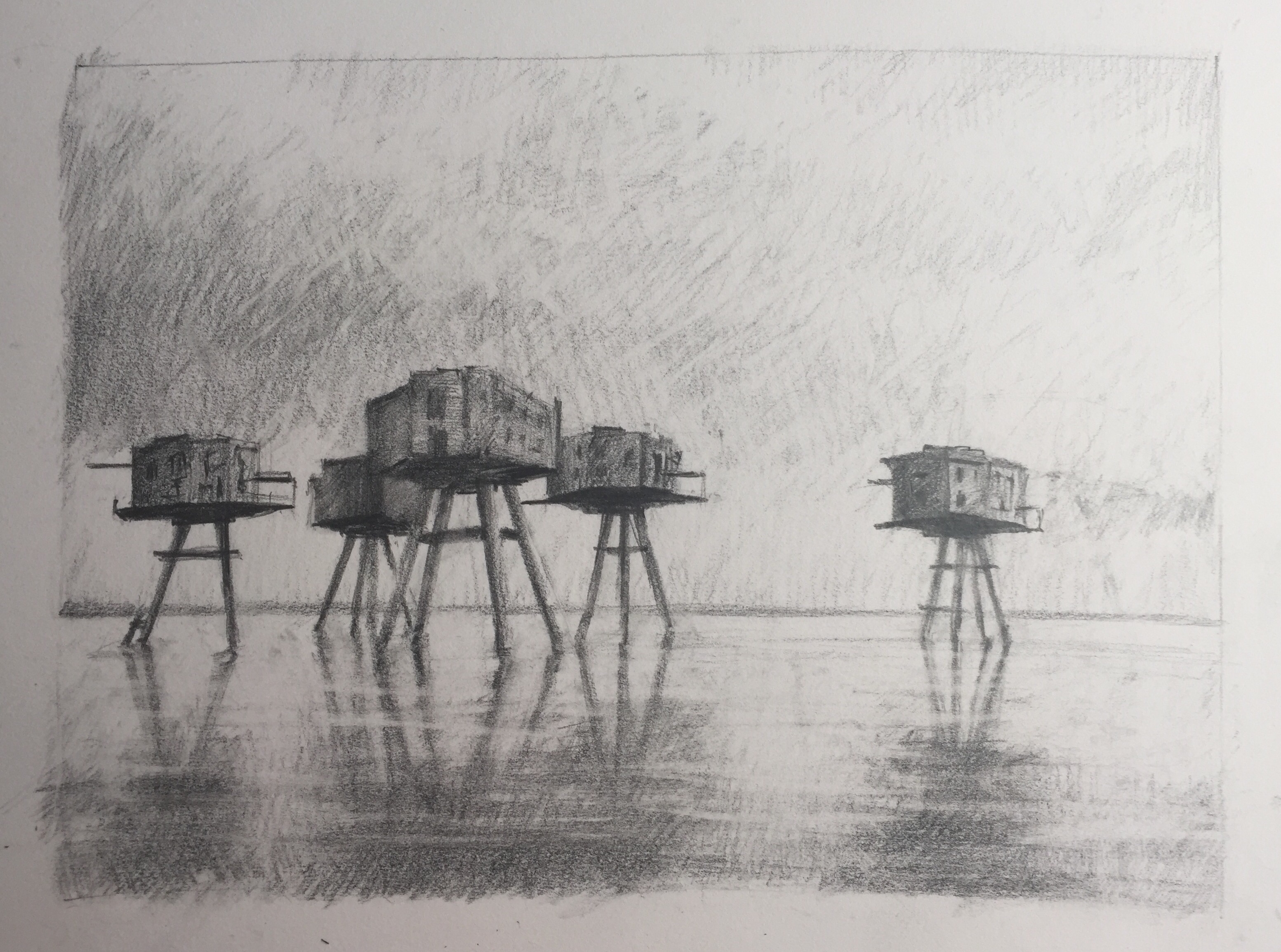 After taking a boat trip out to see the forts, David took it upon himself to tackle this subject in watercolour. Almost a decade ago now, I used to live in the coastal town of Whitstable, where one of these sea forts was clearly visible from the shore, along with the more recent addition to the horizon of an off-shore wind farm. Like David, I had many years ago taken a boat trip out to get a closer look at these monolithic relics and learn a little more about them. Reading David’s blog brought these memories, and those of my time in Whitstable, flooding back to me and before I knew it, I was contemplating a companion piece to David’s work.