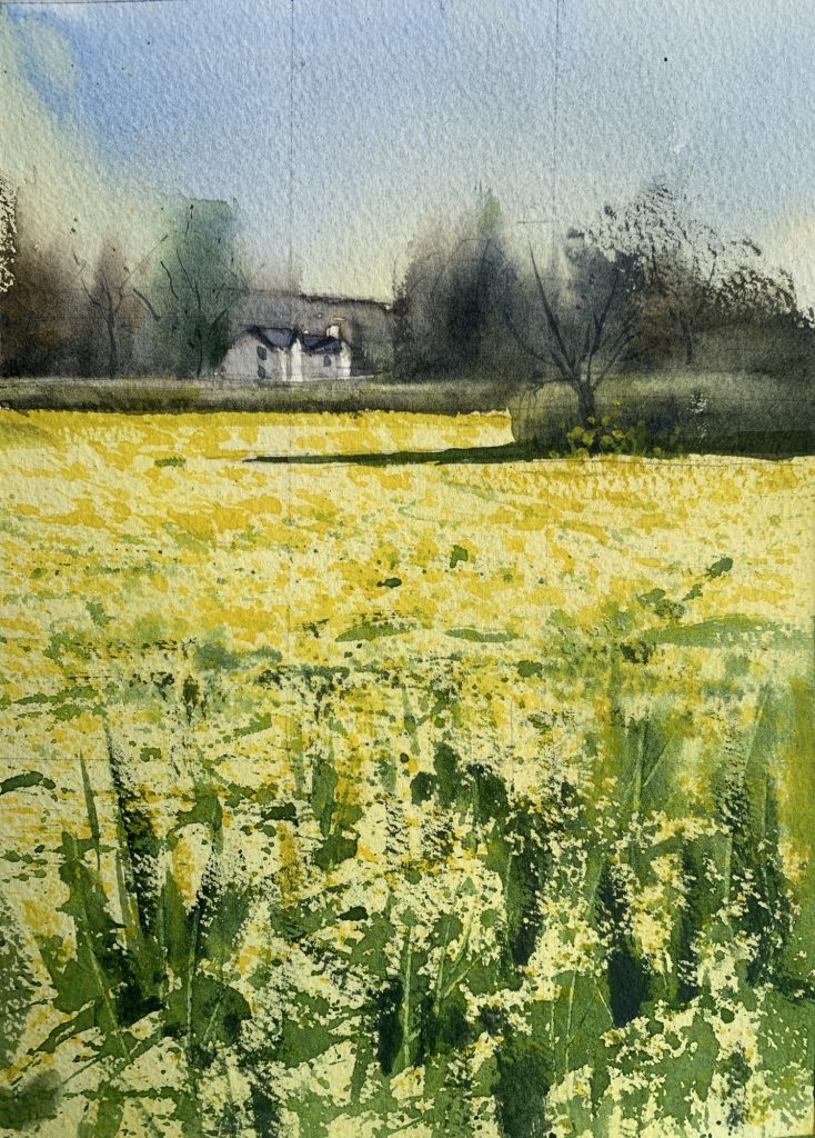 This is a little A5 study where I was keen to find a shorthand way to convey bright yellow field of rapeseed flowers.