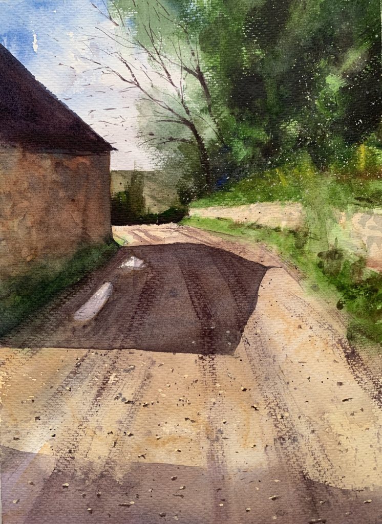 This is obviously quite a simple scene but it felt like a good challenge too. When a view is as simple as this, it focusses the attention on the accuracy of what there is to see! I was particularly keen to try to capture the values and variety in the shadows of the barn wall on the left and the shadows cast across the track.