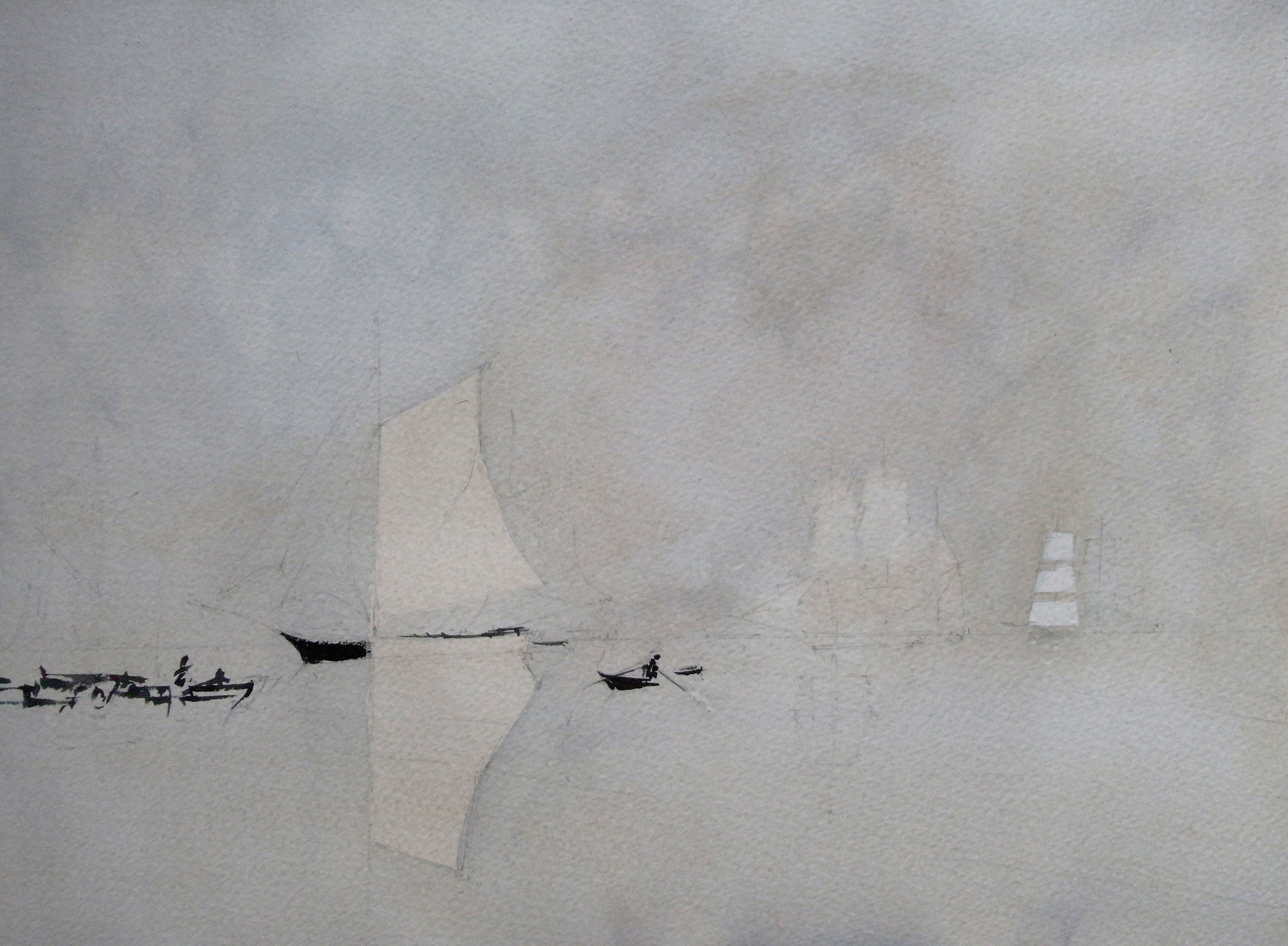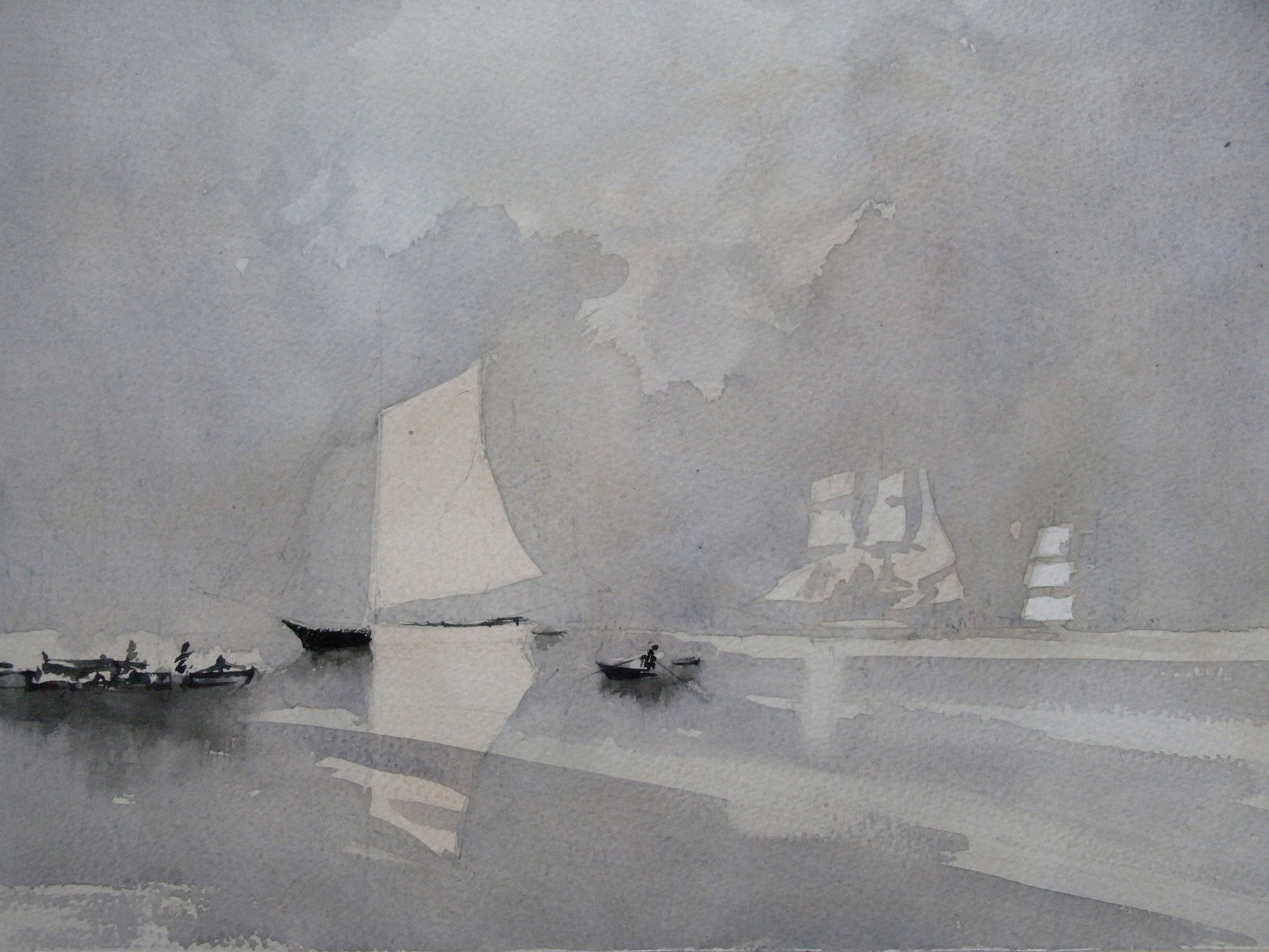 My downfall on this wash was not mixing enough up to cover the page in one go, so I had to quickly mix up some more colour and, in the panic of applying this before I got any hard edges, I forgot to paint around the sails of the second boat in from the right, so I had to try to lift the colour out afterwards but only had limited success. Once dry, the darkest areas were painted with black using an almost a dry brush. (I’ll do another post on the use of black another time)