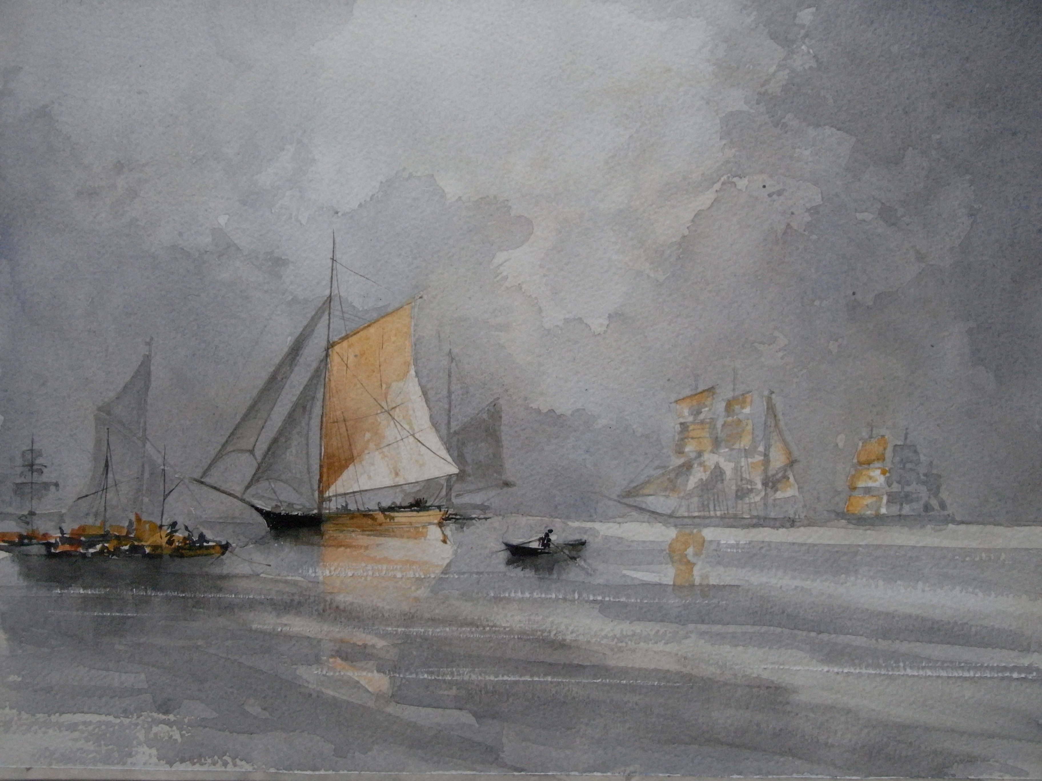Masts and rigging were added wherever I felt appropriate and by now I had left behind Hilder’s guidance and was beginning to freestyle. Mindful of over working and getting sucked into the detail, I made a conscious effort to stop and take stock. I knew from the book that Hilder took this on to another stage, but later regretted having done so. I decided to follow the far better artist’s advice and, aside from scraping in a few highlights with a scalpel into the water, I called it a day.