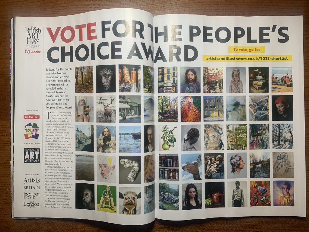 I was finally able to pick up my copy of the January edition of the Artists and Illustrators magazine feature in a double page spread on the British Art Prize 2023 that includes a thumbnail of my own effort, ‘Take me to the river’.