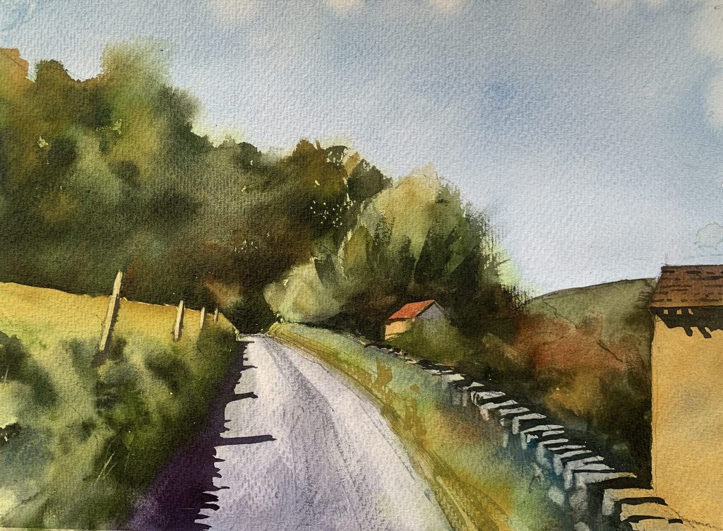 Although the shadow on the road here is too heavy, other areas are much more successful and overall, there’s a good sense of depth to it. I should also point out that this painting was done quite late at night under an electric light and I think that did play a part in my colour balances! (I might have a little more to say on this next week!)
