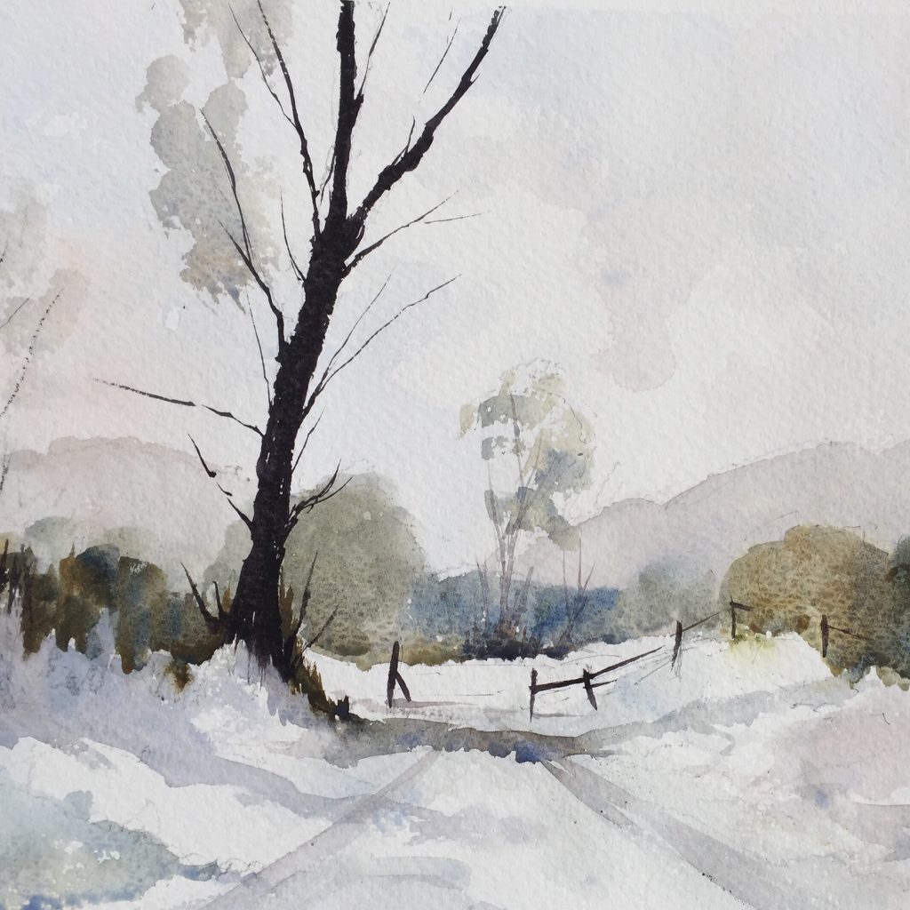 I’ve tried quite a few snow scenes before and, considering the seeming simplicity – surely the white of the paper can do most of the work – I’ve often found them very challenging. I’m usually drawn to the wintery scenes in the run up to christmas. This isn’t down to anything particularly festive, but every year I keep thinking “..maybe this year I’ll get a painting printed up to use as a Christmas card”. Printing even a relatively small quantity would still be cheaper than buying new ones from shops, but I either never manage to do any painting at all, or never manage to paint anything that I’d be willing to print.