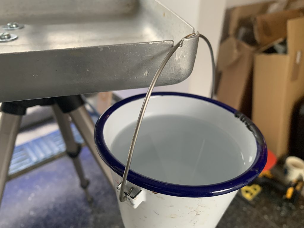 I’ve had a bit of a bee in my bonnet of late. It’s ever since I started to do more plein air painting. I’m happy with one of plein air setups but have been working on a lighter-weight set up. What it’s been missing, however, is somewhere to put things while I’m painting, such as a water bucket, sponge, brushes palette etc.