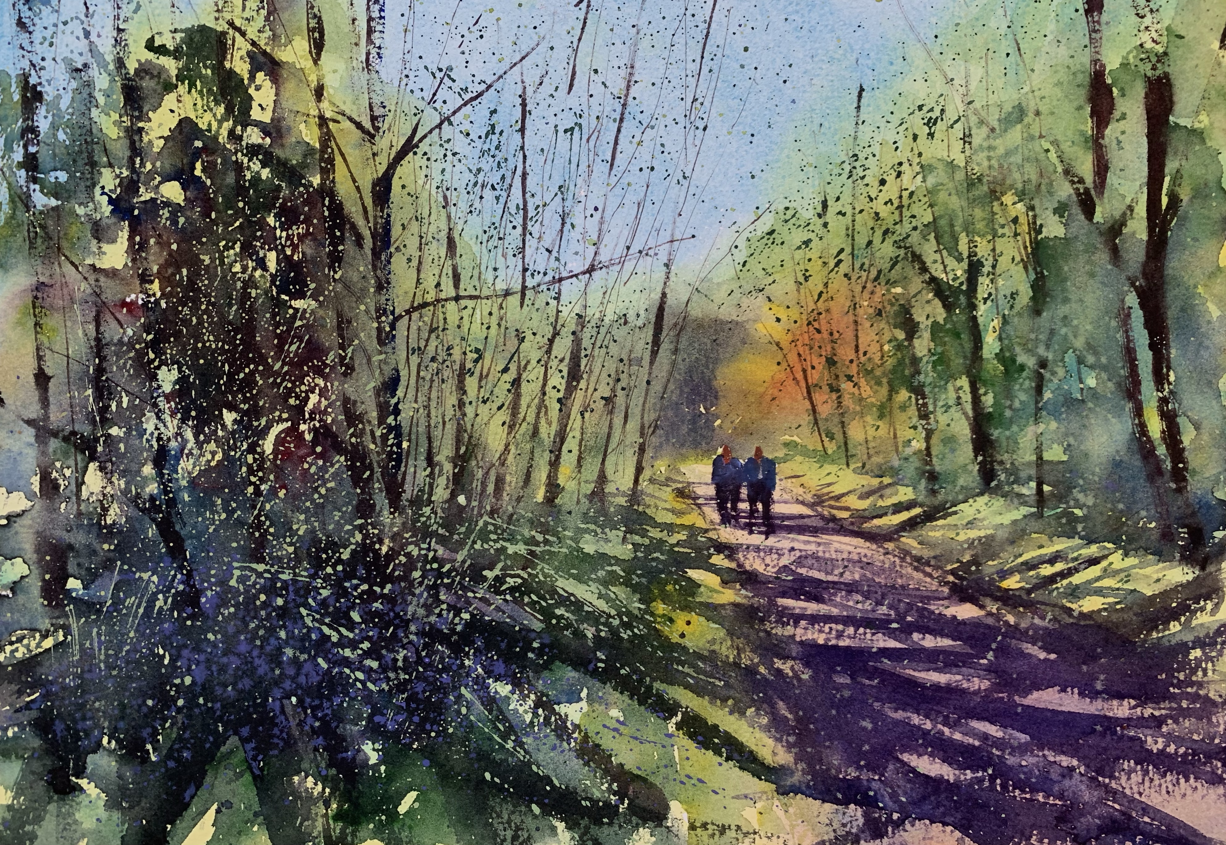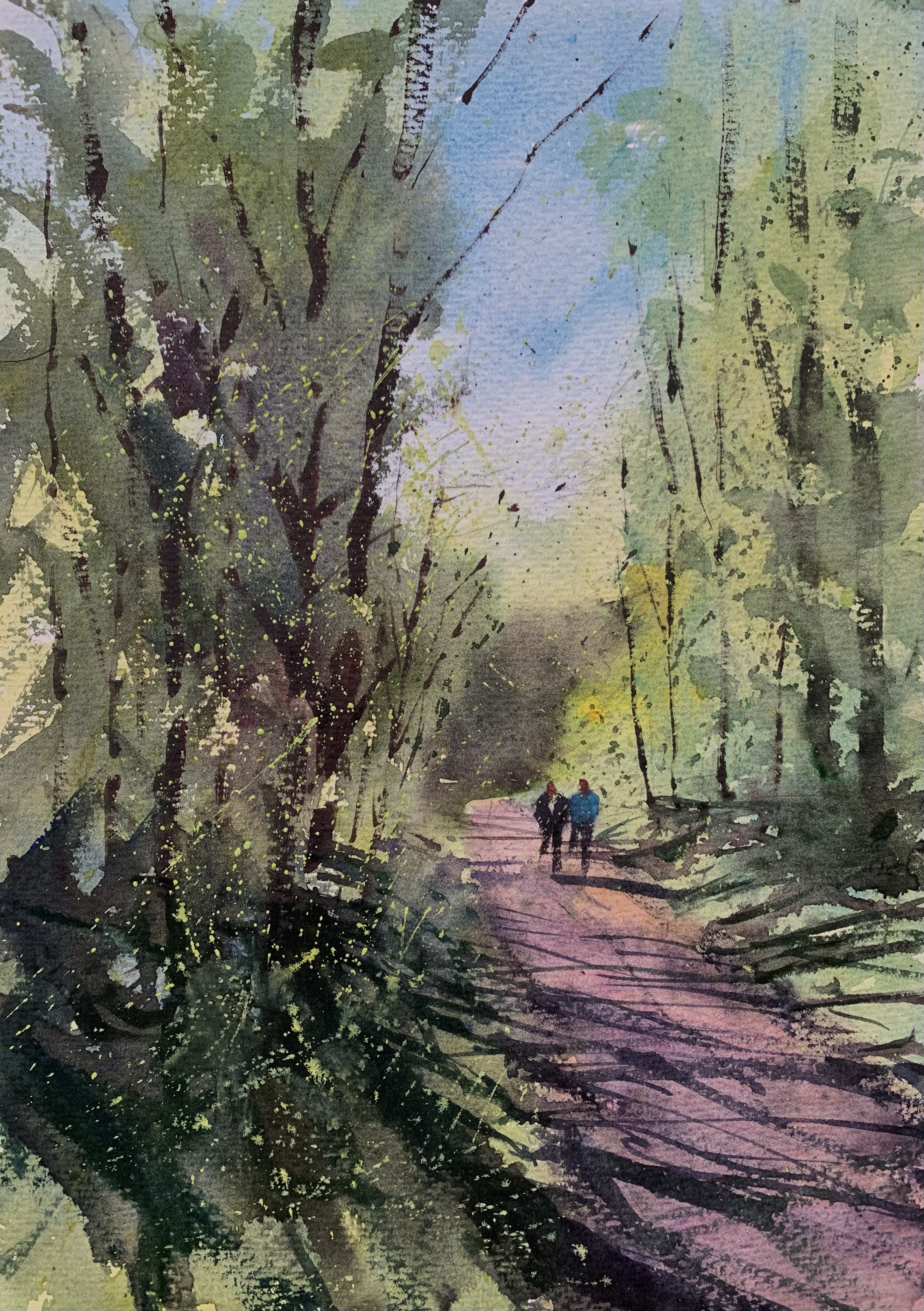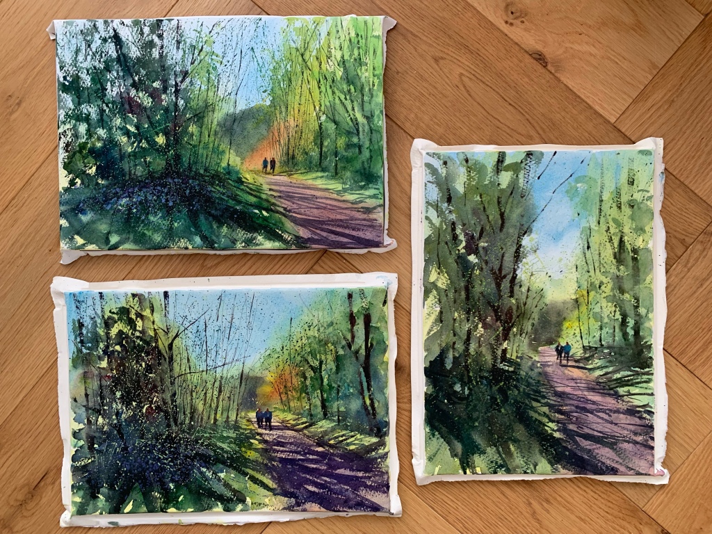 I was quite pleased with how this third effort turned out and, while there are individual elements in my first to paintings that I prefer, I think as an overall painting, this third one is the most successful. I was keen to keep in the touches of the red/orange foliage in the background (though I think this was done more successfully on my second attempt) and suggest the bluebells in the left foreground. The shadows across the path also feel more natural and not as heavy in this most recent version.