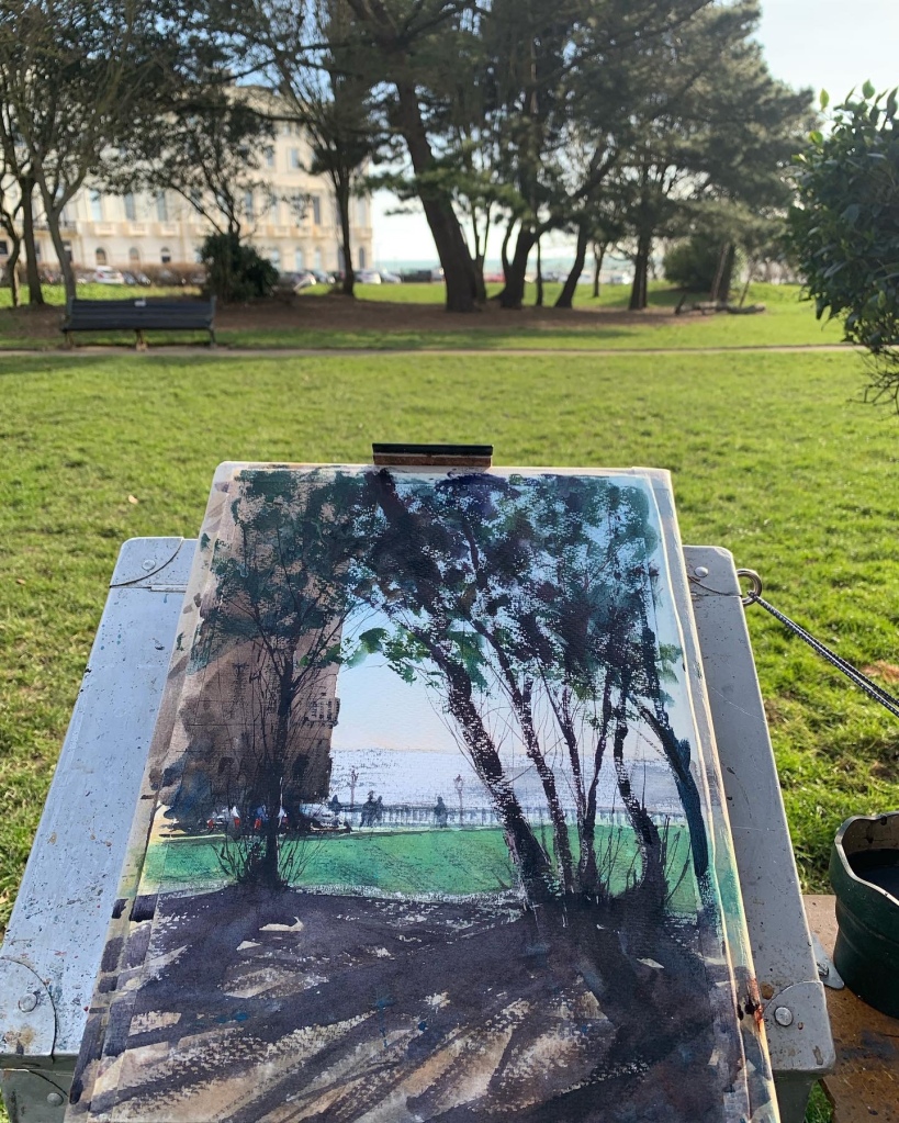 On Saturday 12th February the Brighton Painting Group descended on Palmeira Square, Hove. This was perfect for me as it’s only about 5 minutes walk from my house to the square – although this didn’t stop me from being one of the last artists to arrive. As it’s so close to me, I already know the square well and, a few days ago had the opportunity to do a recce of the square in the most glorious sunshine, so I already had a few ideas in mind.