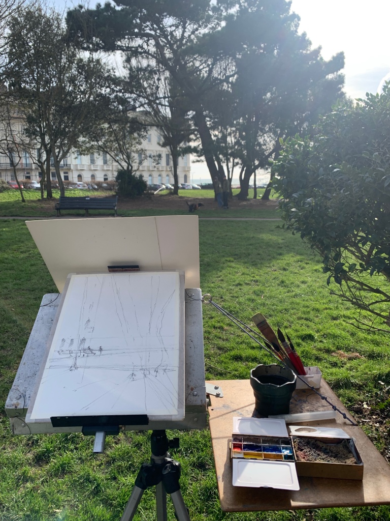 I’m pleased to say that I did find doing the sketch really helpful in simplifying the scene. This meant that sketching out the larger painting was relatively straightforward. Here I am all set up and ready to start painting.