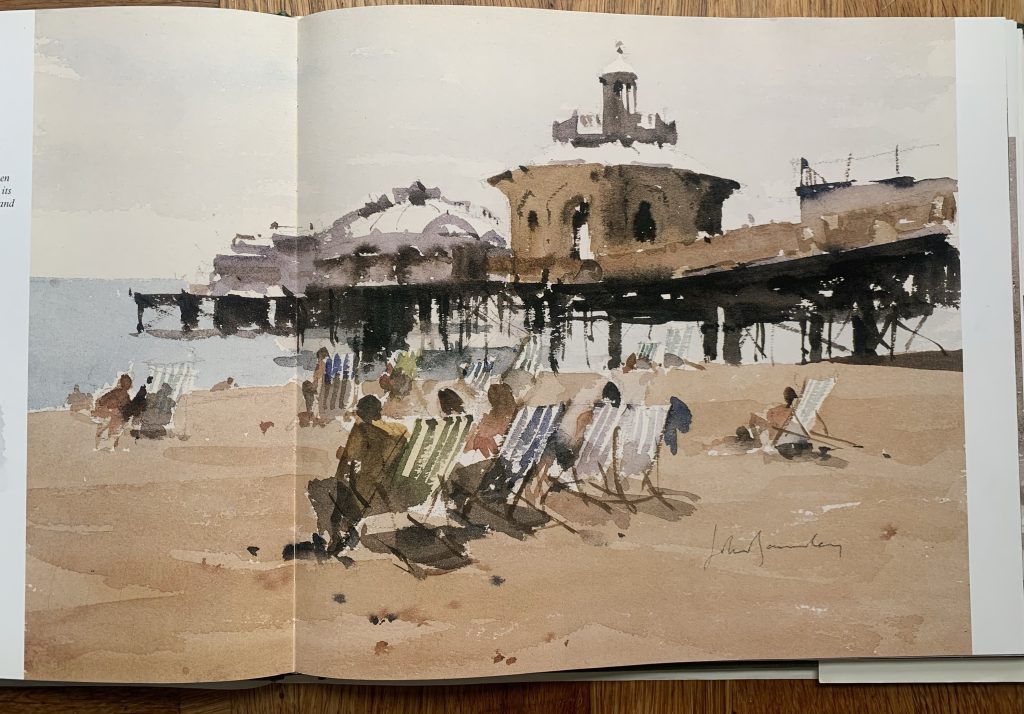 The cover shows his wonderful painting of Brighton’s ‘other’ pier, the West Pier. This pier now lies derelict, slowly crumbling into the sea, but this in no way takes away from the beautiful directness of this painting, which is featured larger inside the book: