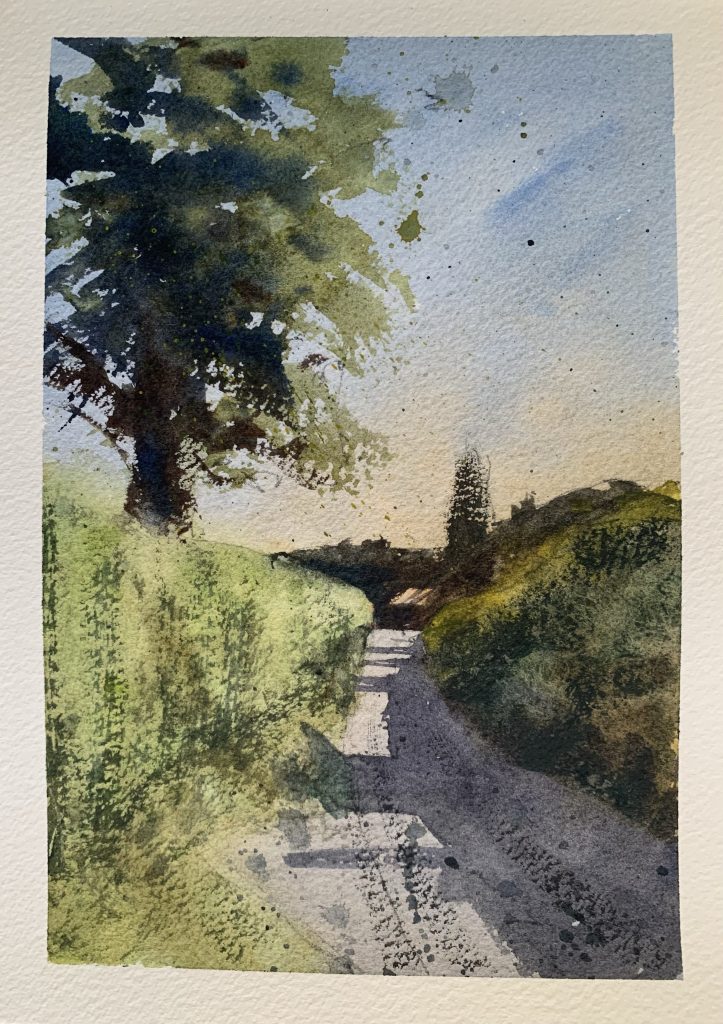 And finally, a view up the lane next to the entrance of the campsite. This one is particularly sketchy as my phone had run out of battery, so this was done from a very quick outline sketch from the screen of my camera. I painted this only a few hours after walking up this lane (yep, the dog again!) so the memory of it was strong in my mind.