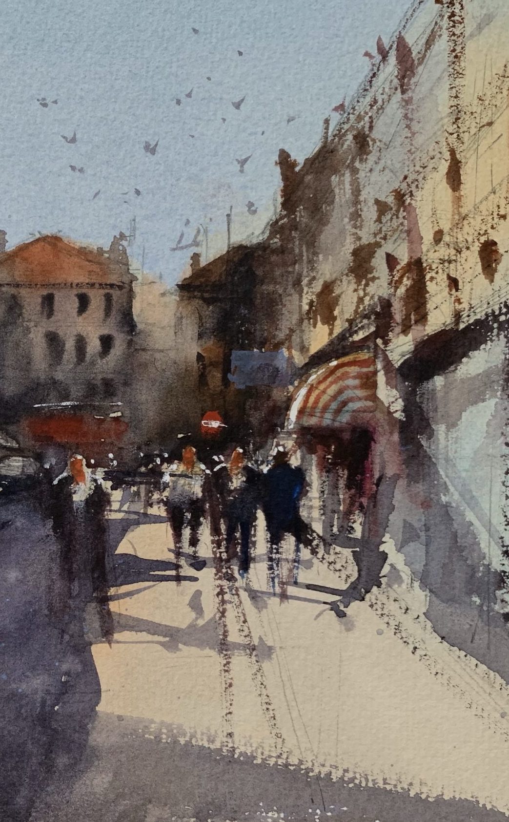 Love the hustle and bustle of London. For me, the light catching the red and white awning makes this painting.