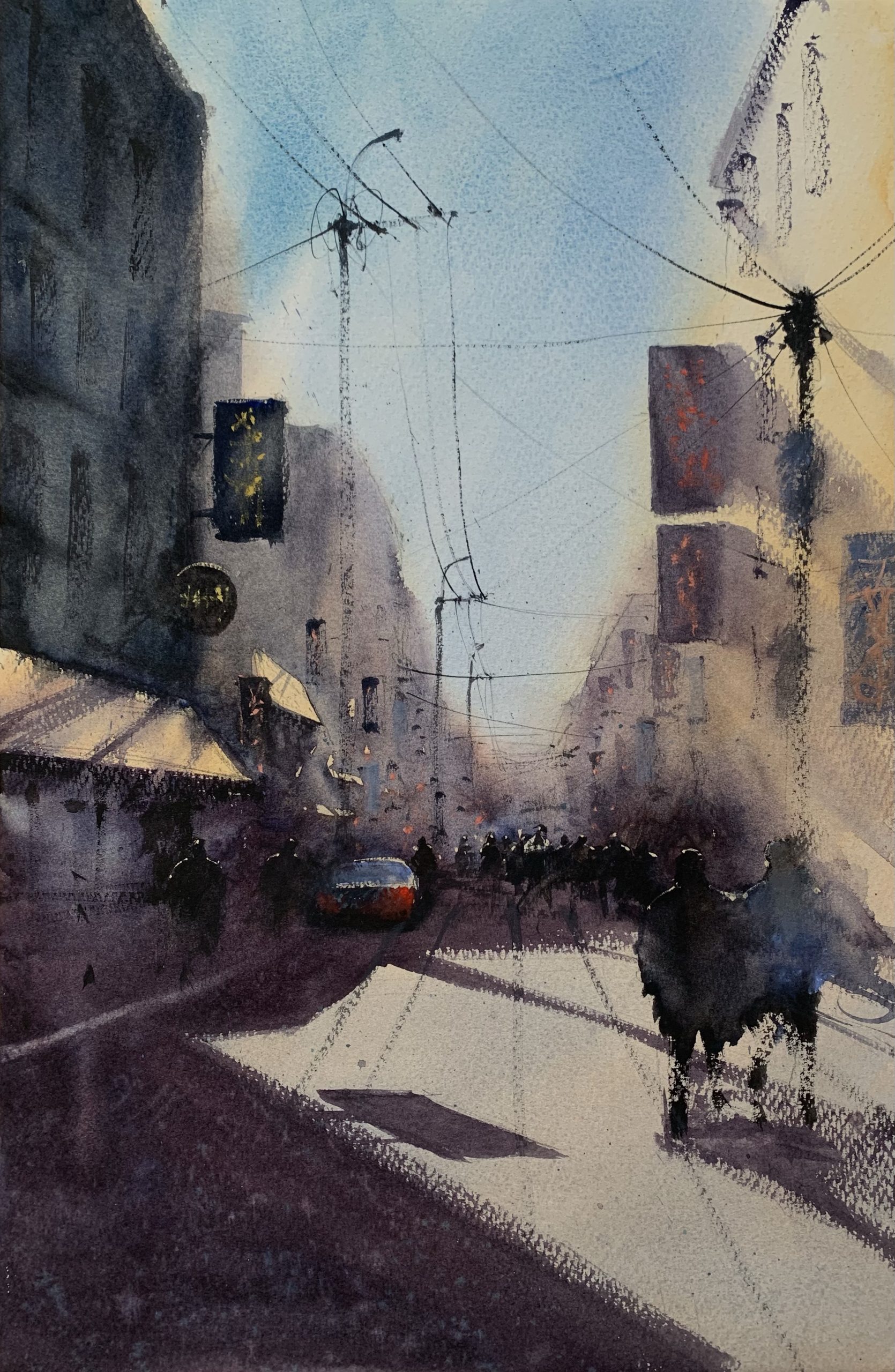 Really liked the feel of this street scene in Tokyo and how the shadows raking across the foreground combined with all the jumble of wires and cables above the street to create a really dynamic sense of energy that I tried to capture with my brushstrokes.