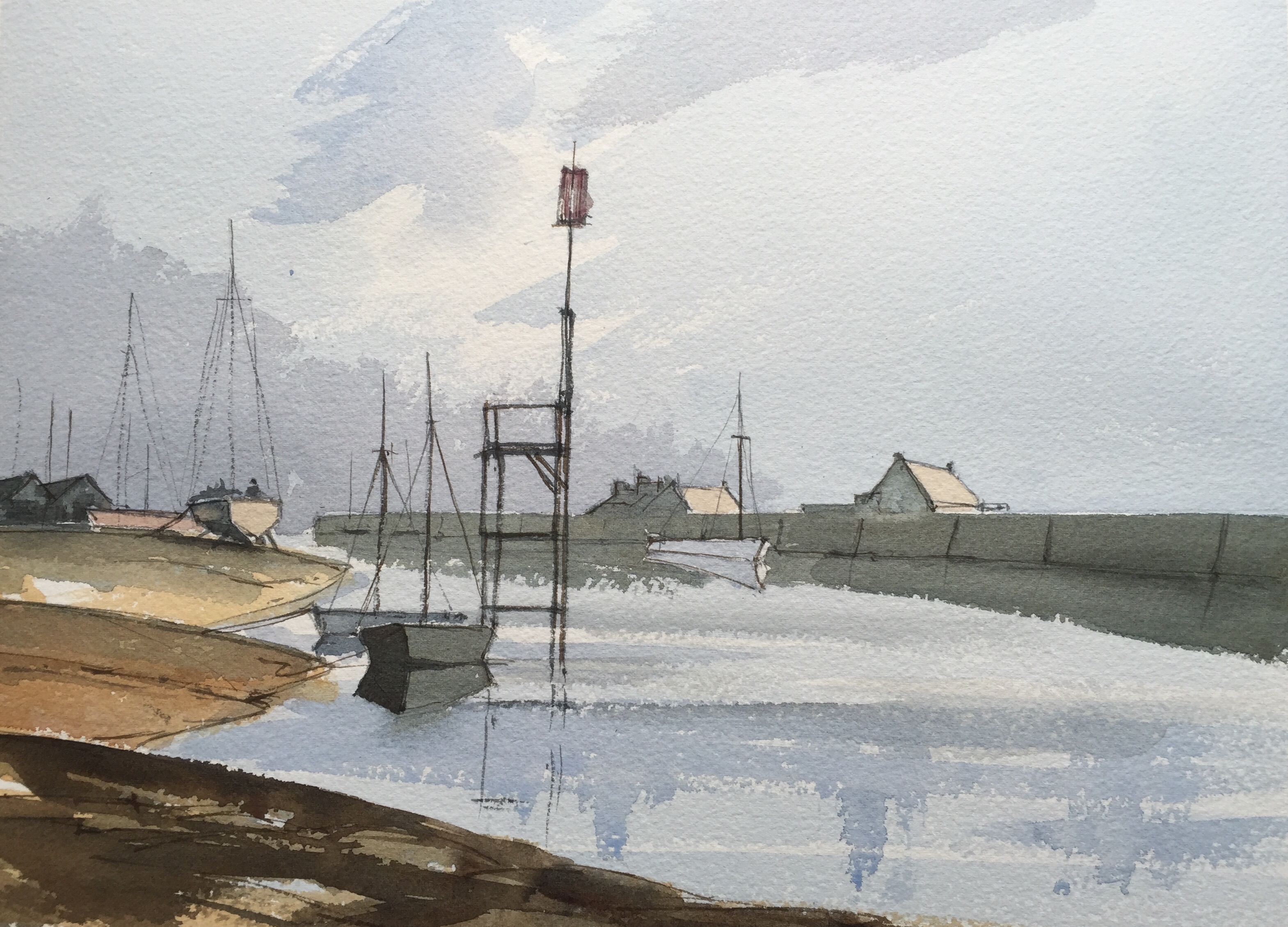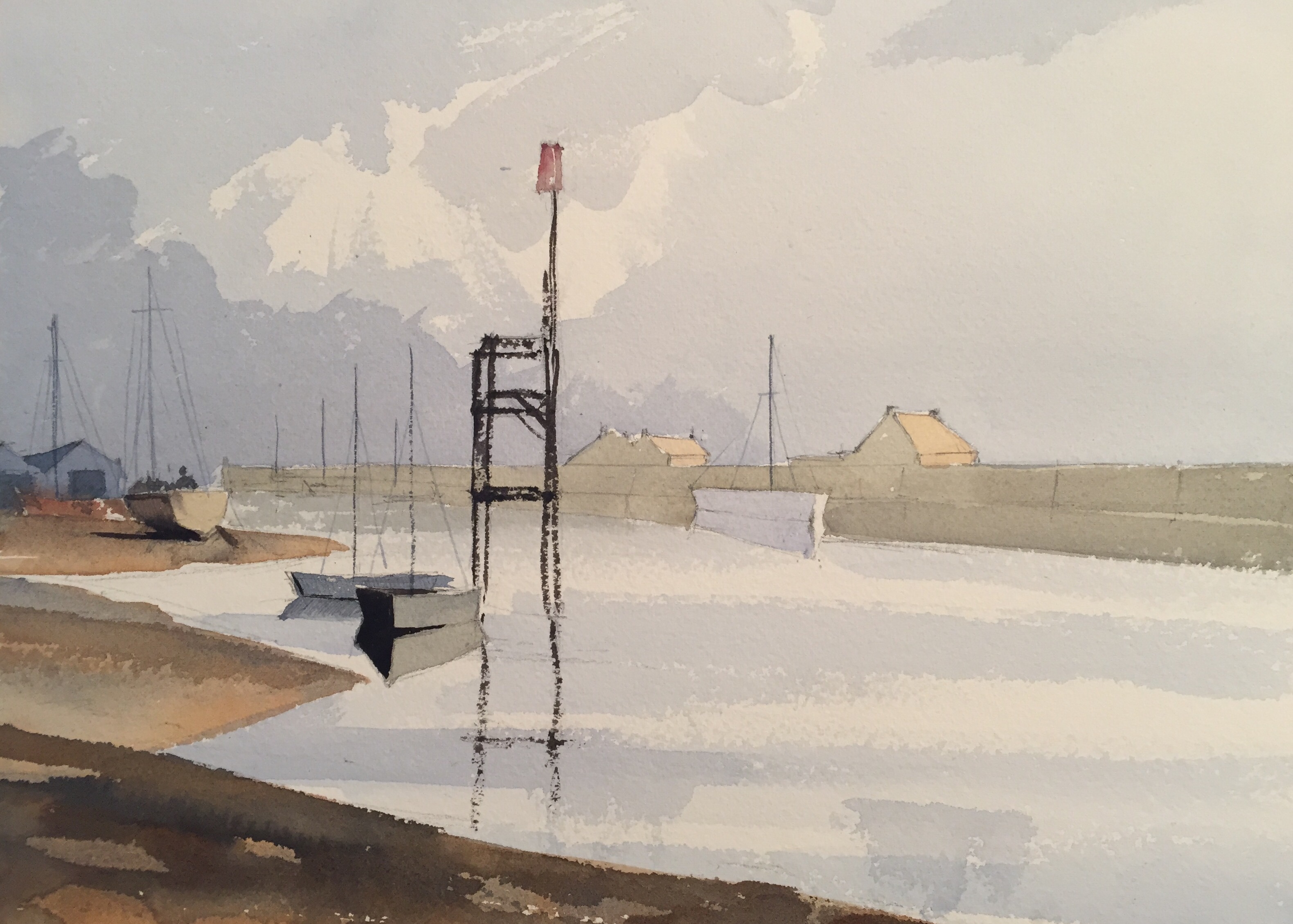 Fortunately I have up my sleeve a couple of efforts that I painted a fortnight ago but haven’t had the opportunity to post as yet, and now seems like perfect timing. I decided to take on a Rowland Hilder sketch of Rye Harbour. The original is a loose (by Hilder’s standards) pen and wash sketch and, while my first effort was little underwhelming: