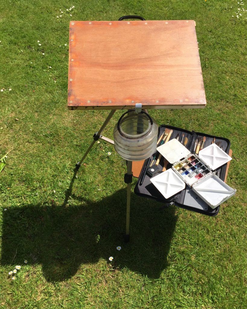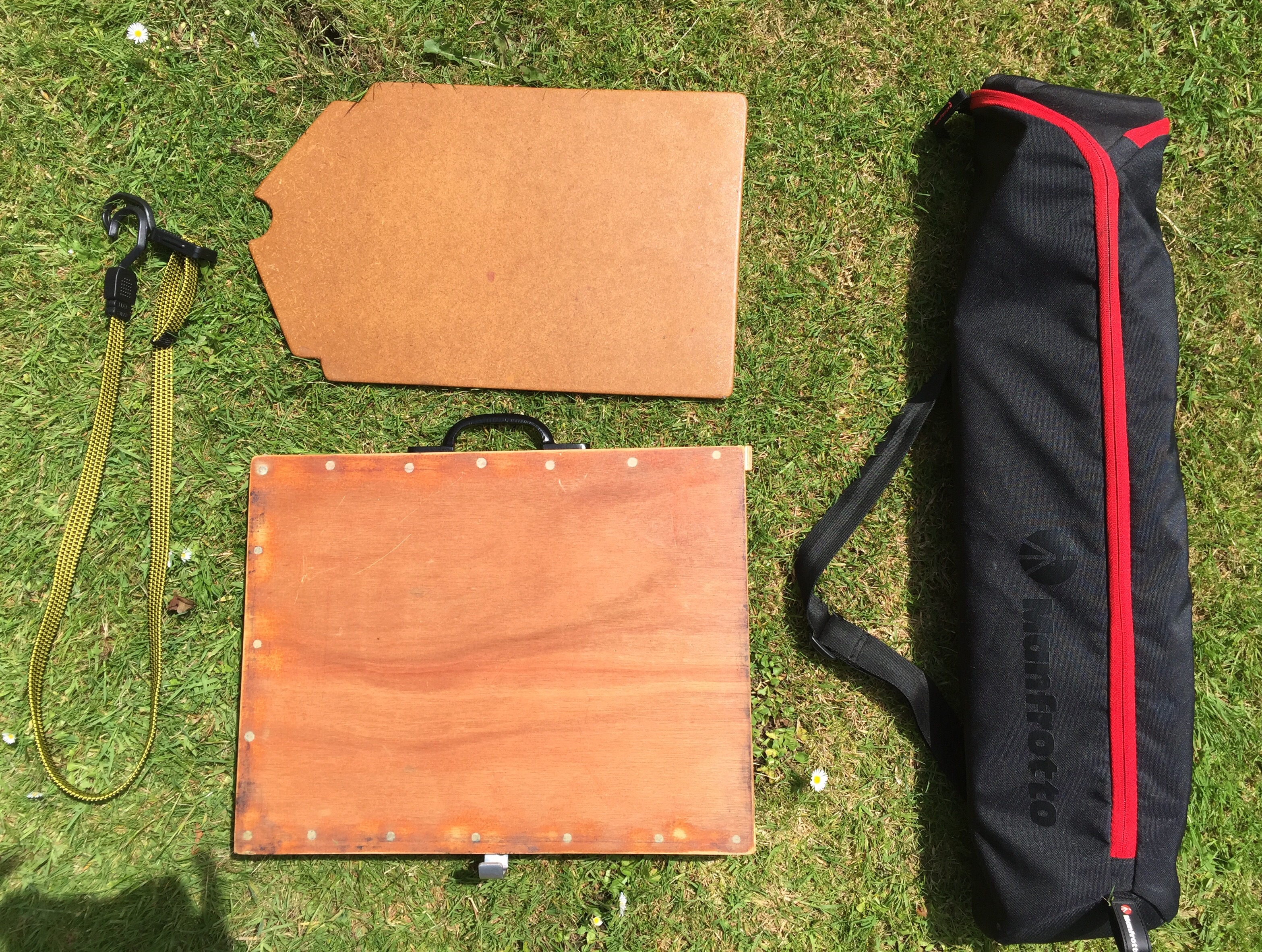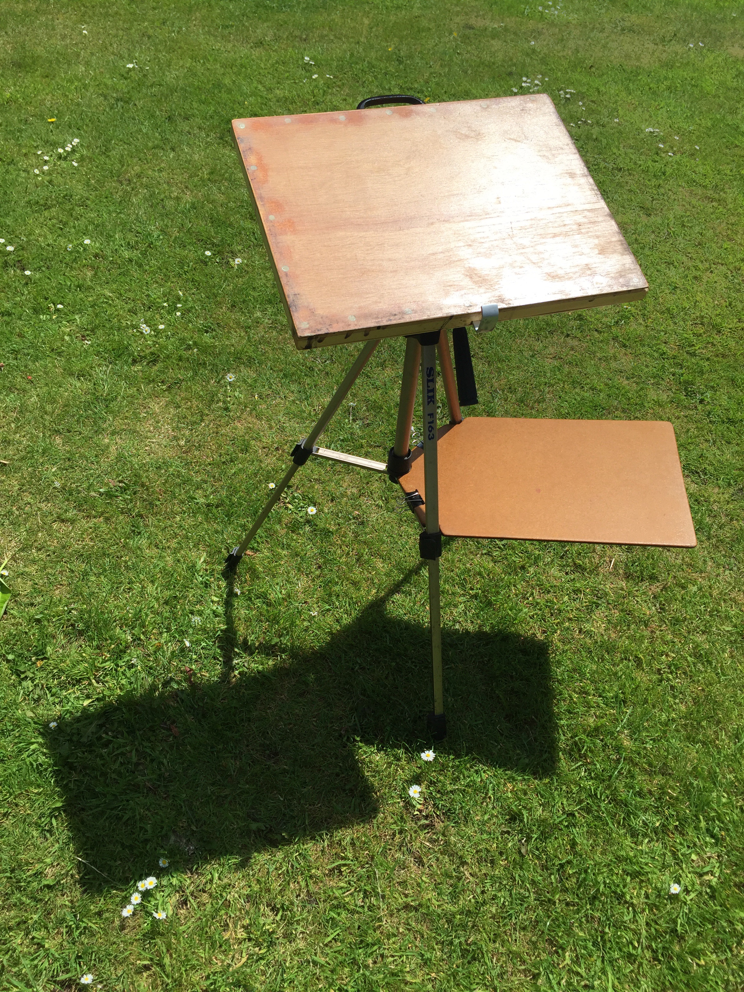 As I think is the case with so many inventions, it was born out of a necessity. How to carry paper safely when painting plein air with the minimum of baggage? I was already using a camera tripod, onto which I’d cobbled together part of an old wooden easel that could take a drawing board, but I wasn’t finding this particularly satisfactory and it didn’t help with my ‘how do I carry the paper?’ dilemma.