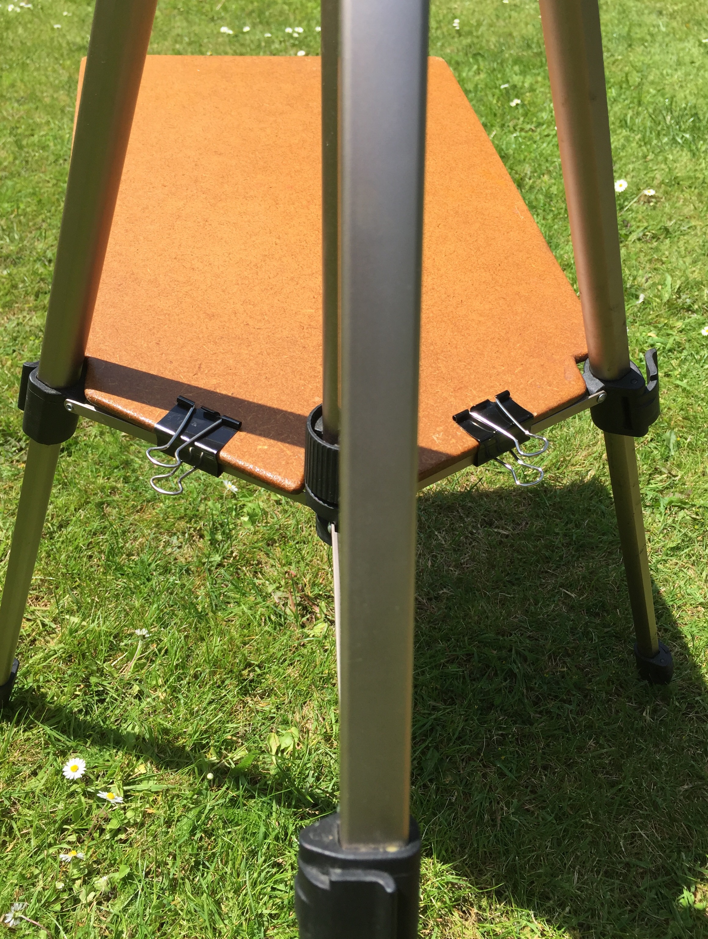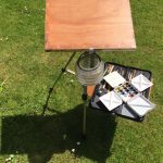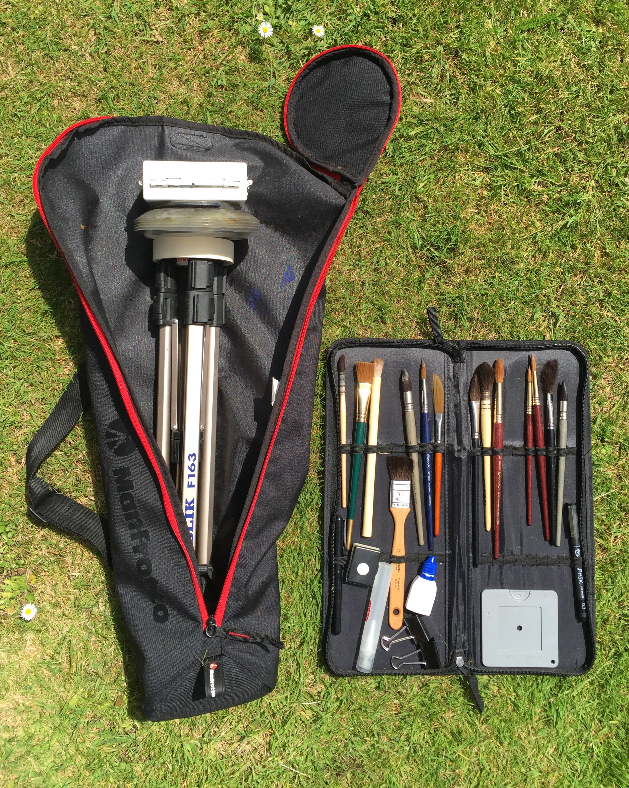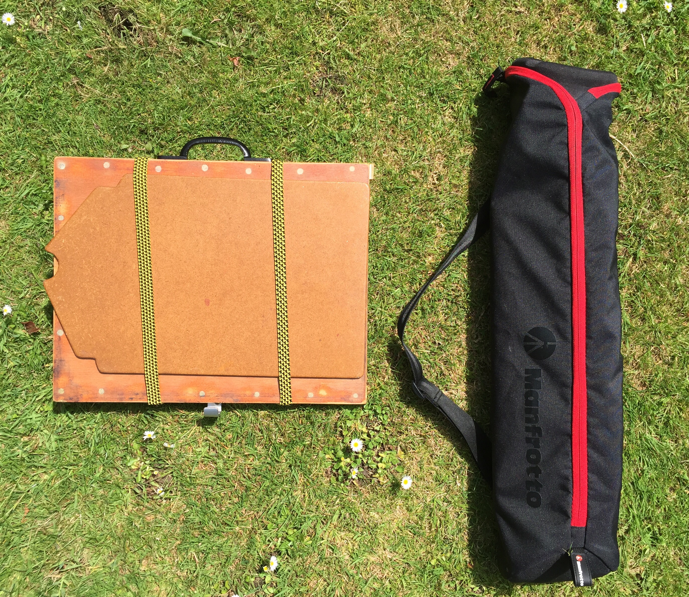 As I think is the case with so many inventions, it was born out of a necessity. How to carry paper safely when painting plein air with the minimum of baggage? I was already using a camera tripod, onto which I’d cobbled together part of an old wooden easel that could take a drawing board, but I wasn’t finding this particularly satisfactory and it didn’t help with my ‘how do I carry the paper?’ dilemma.