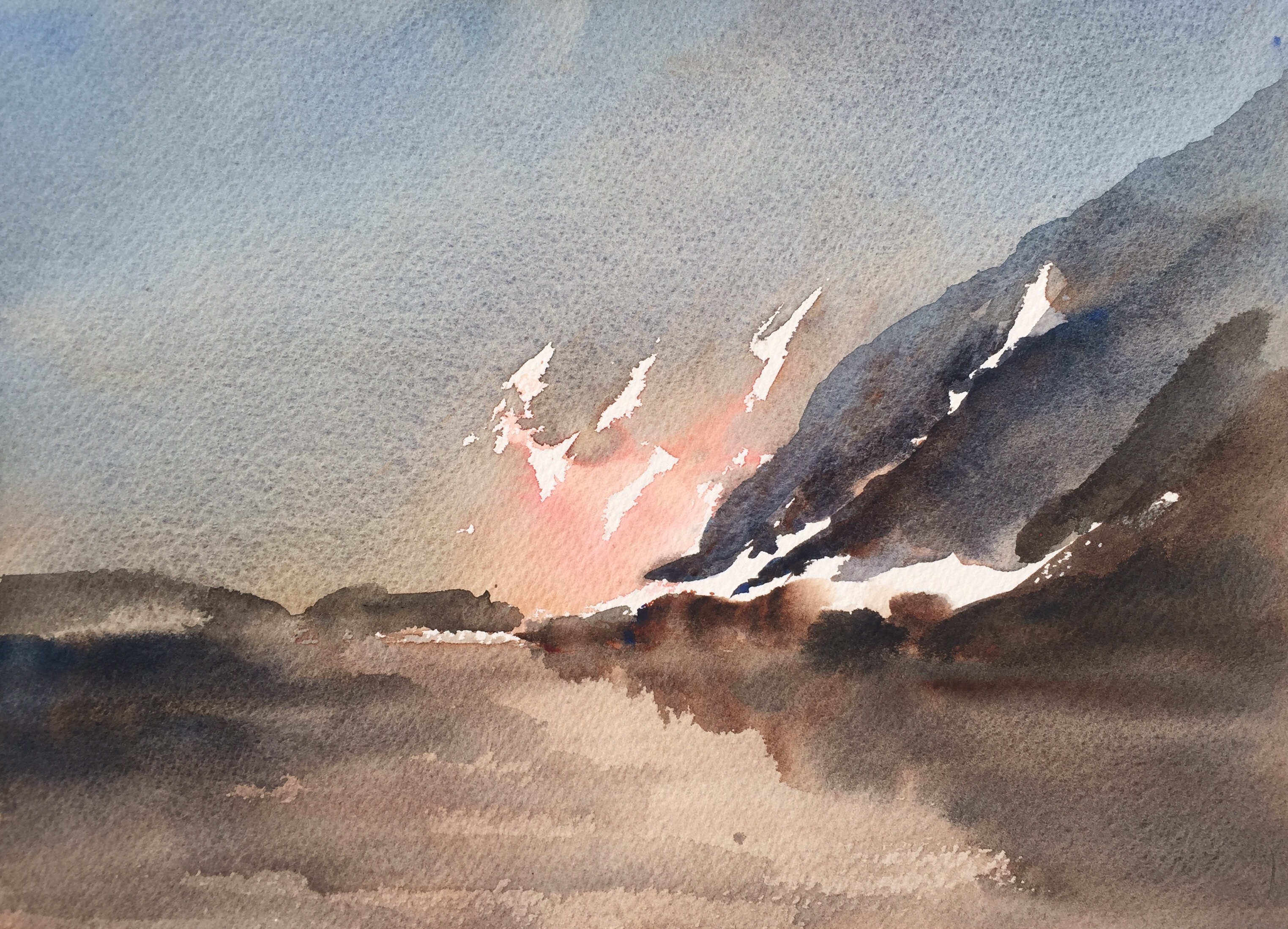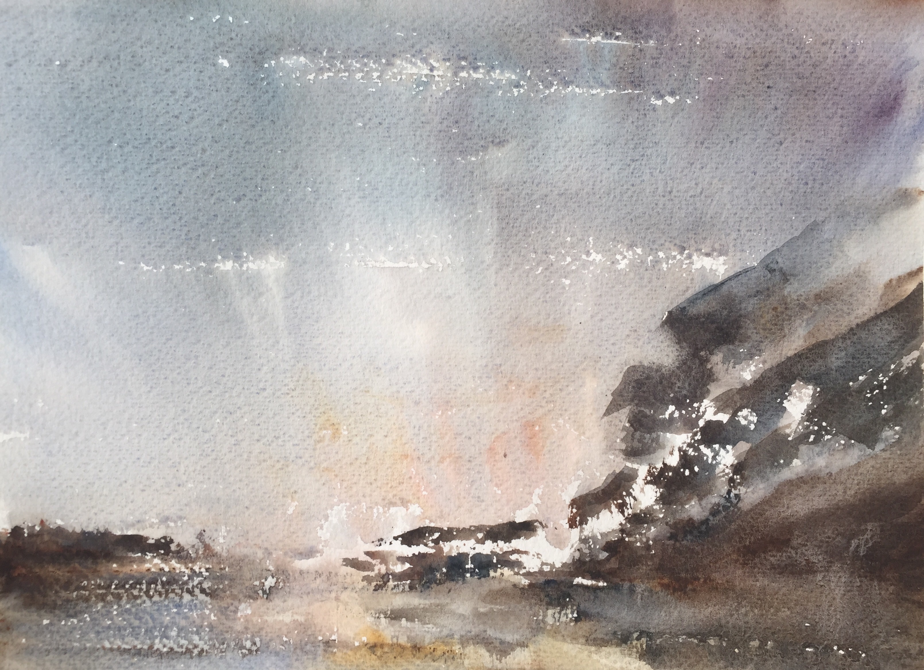 With this next painting I spent much more time on the sky, constantly flooding in more and more colour, and moving the wet paint about on the surface on the paper. A friend had commented on the original sketch that the sky had a real energy to it, and I was keen to try to capture this energy in the sky and thought that the brushstrokes might help convey this. Again, I started with dark tones first and then worked around them.