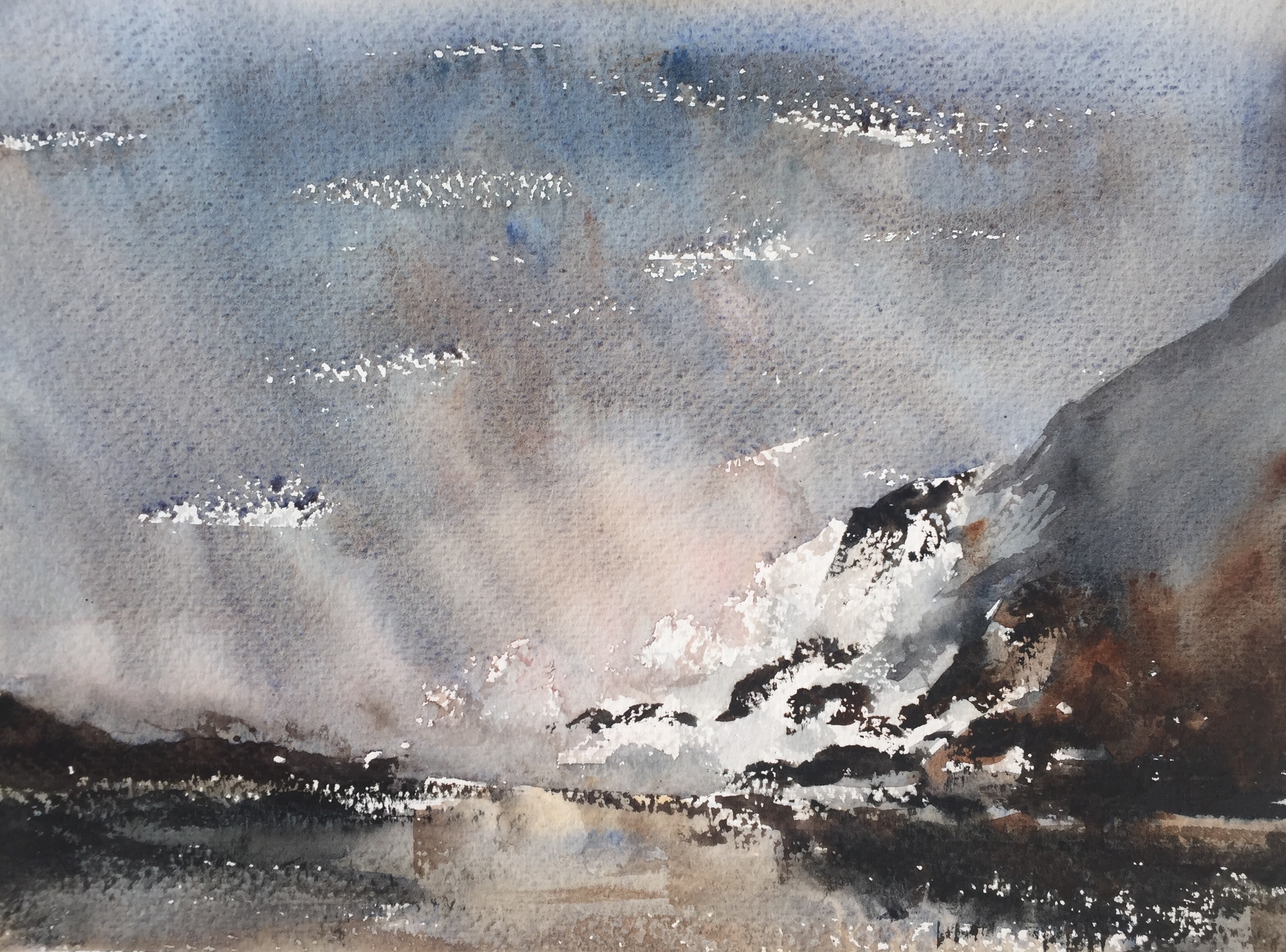I have to confess that whilst it still only bears a fleeting resemblance to the original sketch, I’m really pleased with this final version. I’m not sure it says breaking waves – but I’m definitely getting a stormy sky. The contrast between the darkest rocks against the lightest areas of the sky helps with the drama and provides a strong focal point. I also like the economy of the foreground and the richness of the colours.