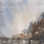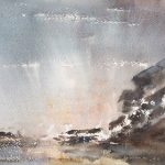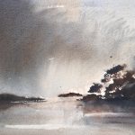 Oh, I should perhaps mention that none of these paintings had any preliminary sketching out. As I wasn’t looking for detail as much as I was atmosphere, and the composition only has a few elements, I didn’t think it was necessary. So, for this one I applied my darkest tones first. This enabled me to get some nice dry brush features that could suggest the foaming spray of breaking waves that I could then work around with the subsequent washes. This was much closer to the sketch and scene that I was seeking to capture, but I thought I’d gone in too heavy with the darks – that they were a little too dark, and that they deaden the image.