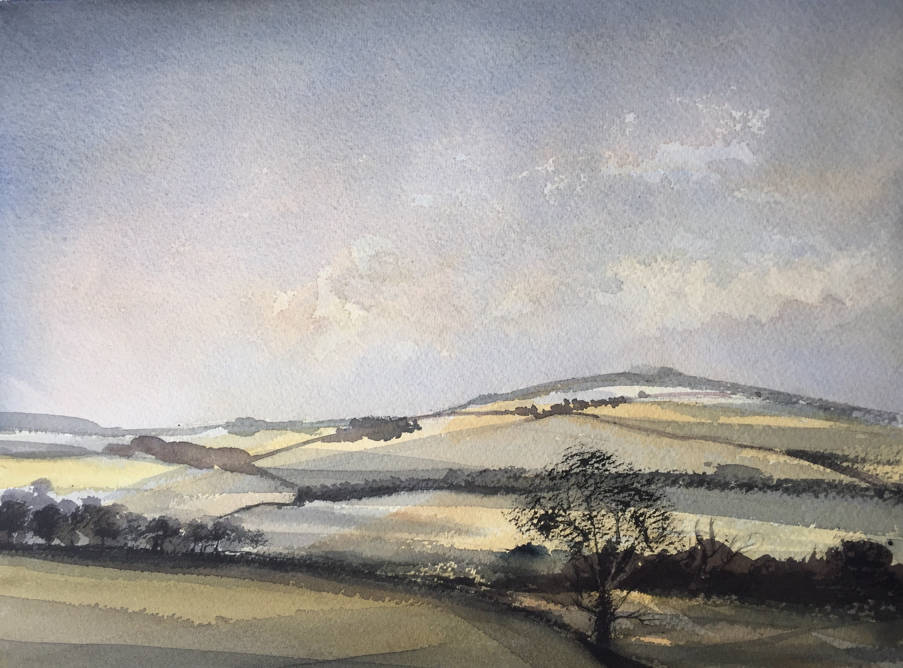 I looked over my library of books and selected one of my favourites: Rowland Hilder’s Sketching Country, which I particularly like because as the title suggests, they’re his sketches and notations. Still unmistakably Hilder, but looser and more immediate than many of his finished works. Against my better instincts, I was drawn to one of my favourites – a sketch of the North Downs. I’ve always shied away from this, I think because I’m most familiar with the genius of the original sketch, which is utterly stunning. My aim therefore wasn’t to replicate exactly, but follow a similar approach to try to capture some of spirit of this painting.