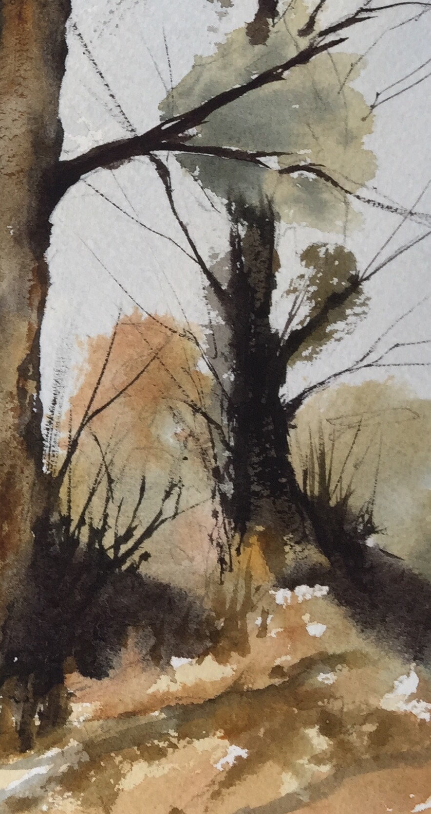 I think it’s a sign of how far I feel I’ve progressed of late that I’m distinctly underwhelmed by this painiting. I do like the harsh contrast of the twigs and undergrowth at the base of the trees on the right against the diffused distant trees, and some of detailed elements of where colours have bled into one another, but there’s a whole host of aspects that I don’t like about this. The three trees on the left for instance. Why I did three of them all leaning at the same identical angle and with almost identical growth patterns is beyond me. The main tree also. The light is supposed to be falling on the left of the trunk but I haven’t captured this at all (why is the trunk brown-ish, but all of the branches in every direction are black?)