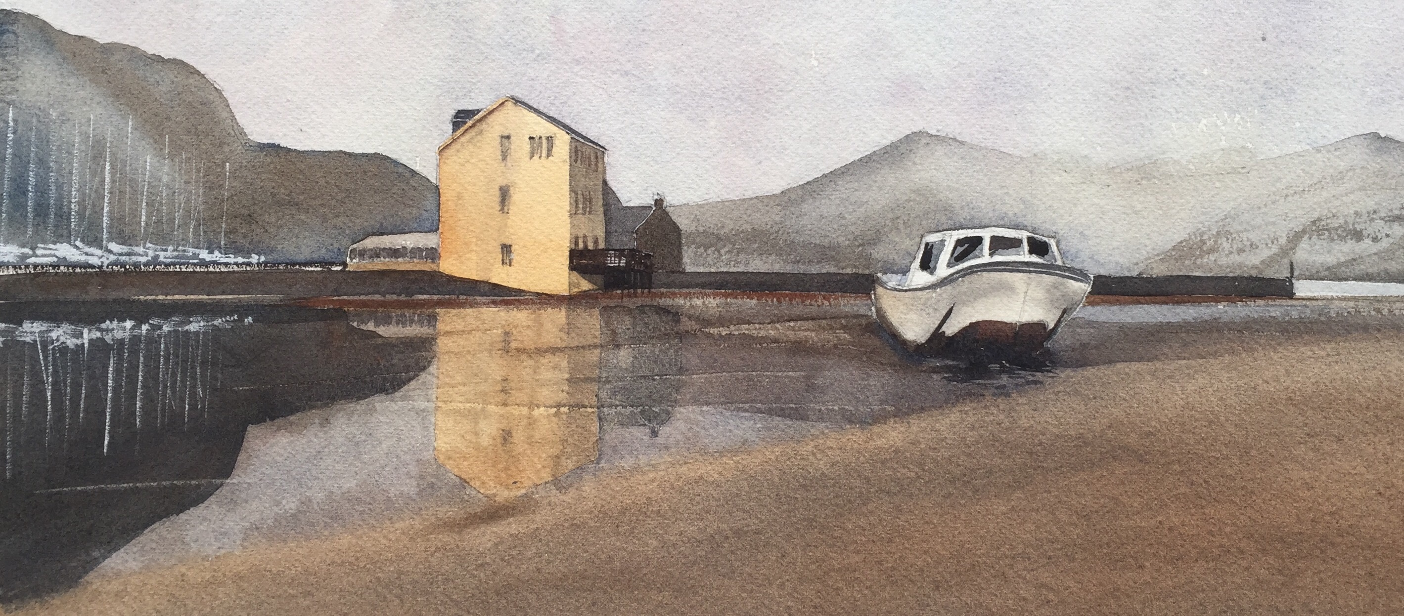 When I started painting I tried to introduce a little more colour into the sky than I’d had previously – aiming for some heavy purple-ish grey rain clouds – but ending up with some rather too obvious bits of Alazirin Crimson! From this point on, everything else became a bit of a frenzied blur as I scuttled here and there across the paper – working on one element whilst another was drying, but trying to work as broadly as possible and not fiddle. The distant hills to the right went in much paler than in the previous attempt and I was keen to get a softer lost and found feeling across the hill tops. The darker hills to the left of the building were also done much lighter in tone that I had done previously.