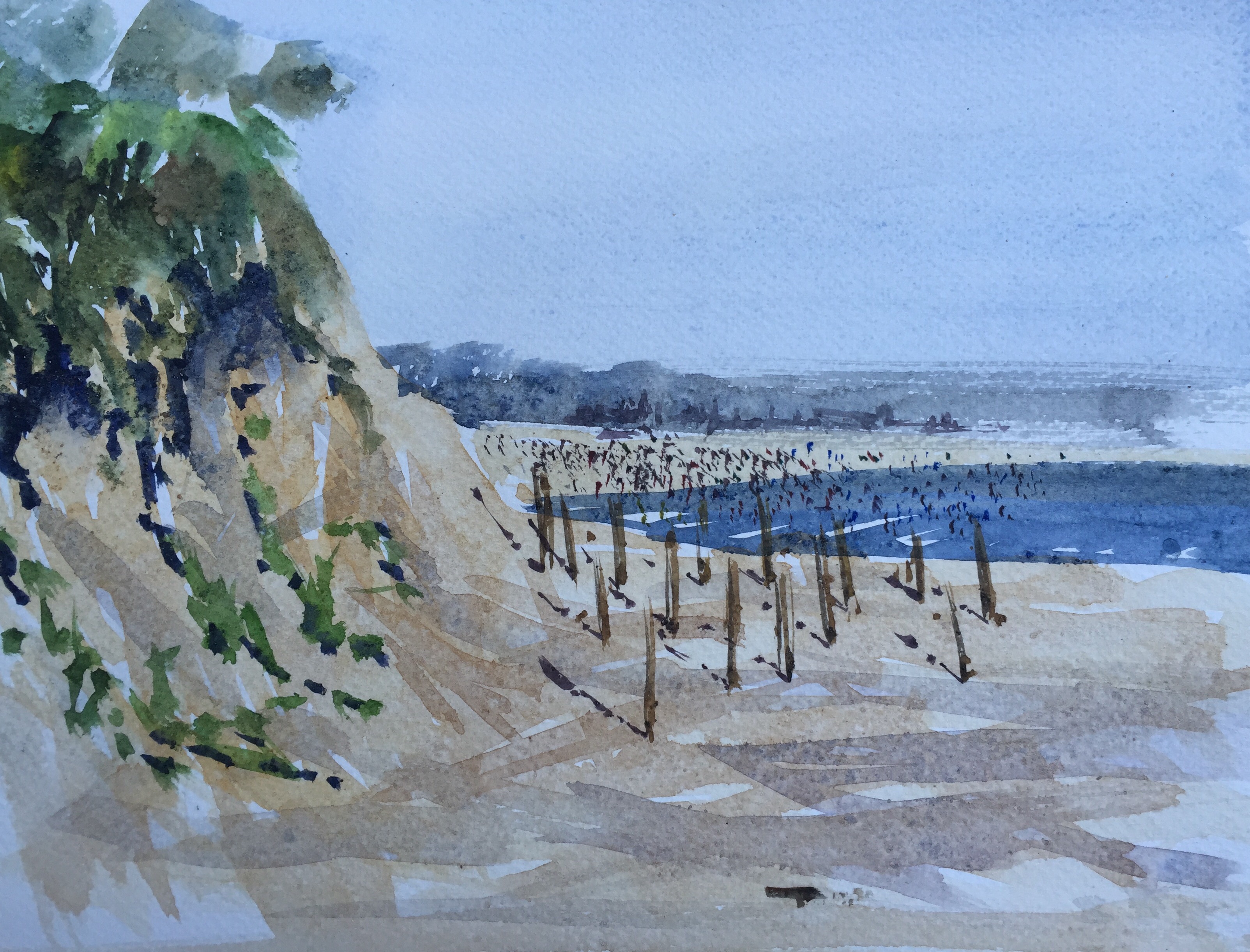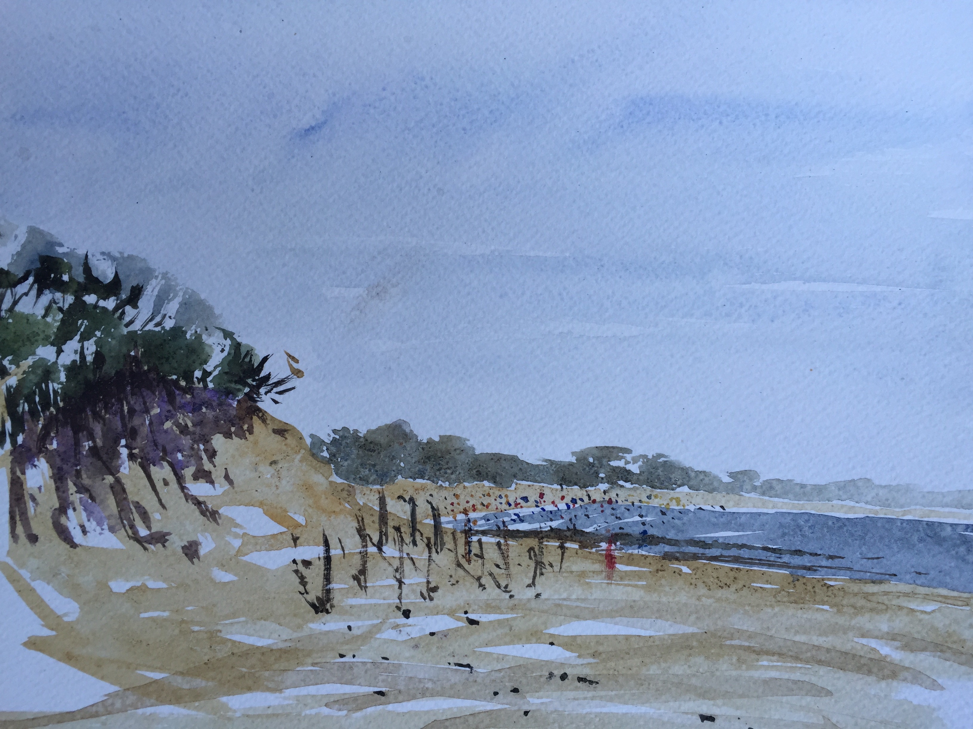 I managed to get a little time today on a crazily windswept beach which was fun but incredibly challenging. It’s nice however to try out my ‘sketching kit’ – an A4 Arboreta sketchbook, a selection of sable Escoda travel brushes and my Winsor and Newton travel box. The wind was really blowing and there was sand everywhere – on top of which the view was more to do with what was in front of me rather than anything that I’d naturally choose.