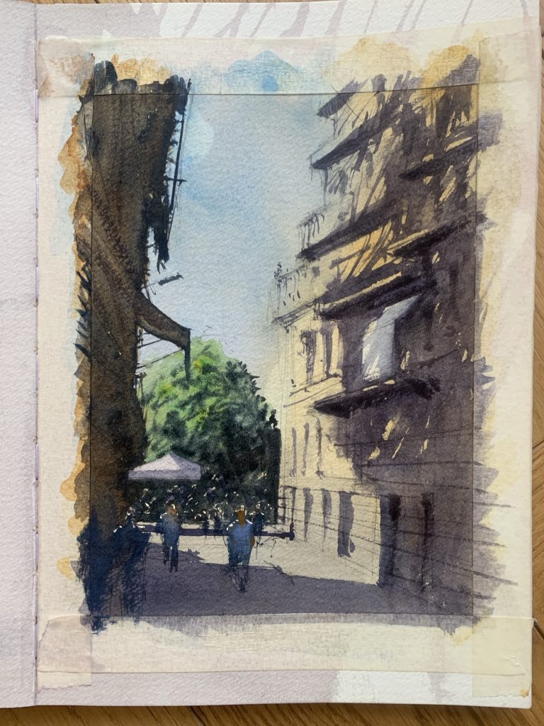 I’d just sketched out this A5 study that I’m thinking might work at a larger scale when I toppled a full glass of red wine right over my sketchbook!