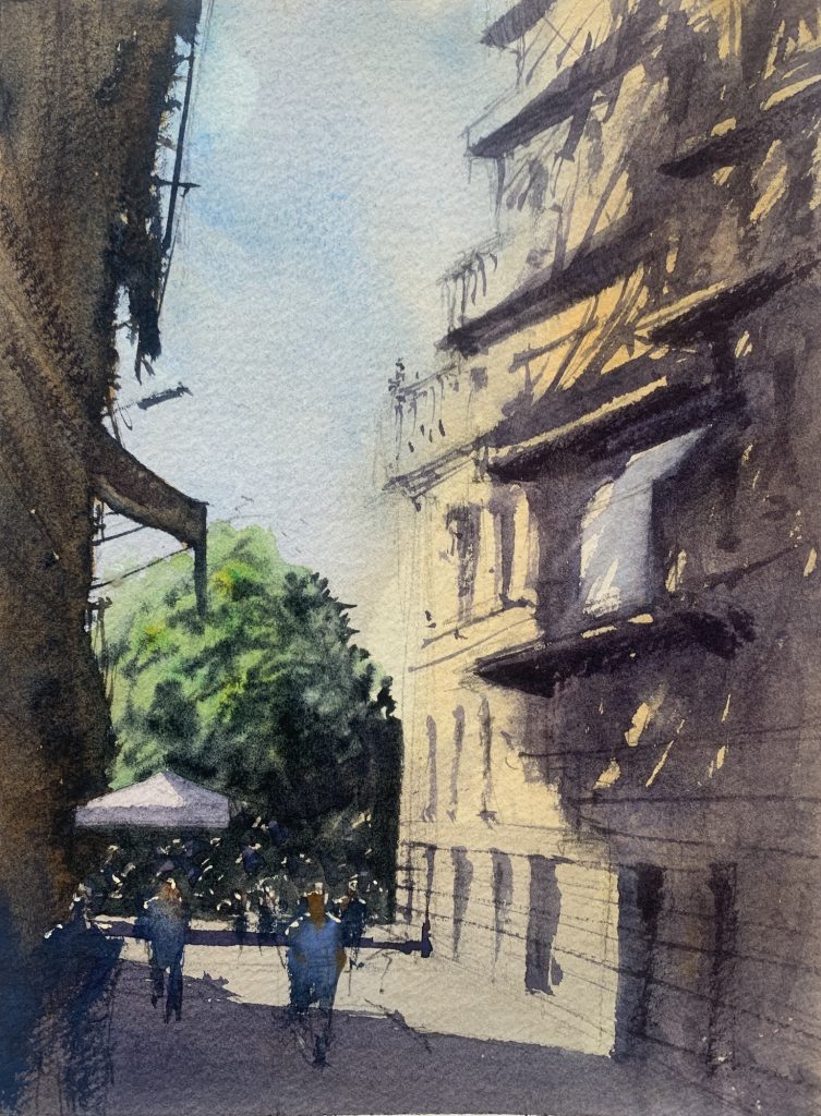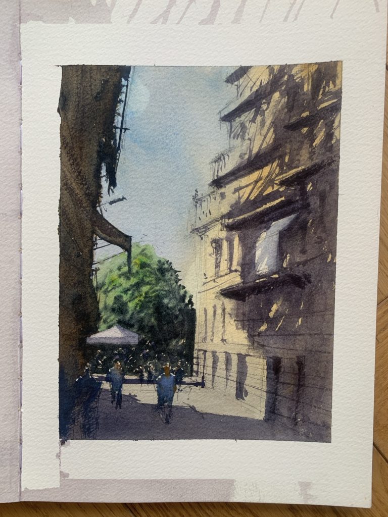 As much as I quite liked the effect of this first wash, I decided that to not carry on with the sketch would be a total waste of a good Tempranillo!